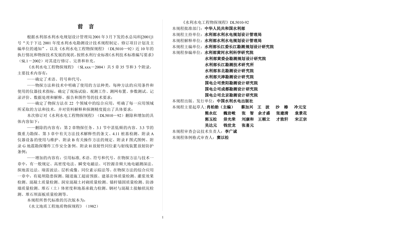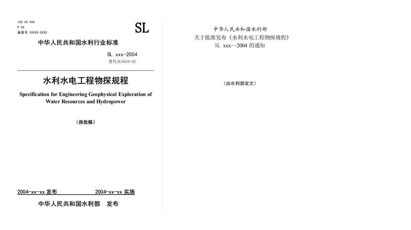 ICS XX.XXXP XXSL中华人民共和国水利部备案号XXXXX--XXXX关于批准发布《水利水电工程物探规程》中华人民共和国水利行业标准SL XXX一2004的通知SL xxx-2004替代DL5010-92水利水电工程物探规程(由水利部发文)Specification for Engineering Geophysical Exploration ofWater Resources and Hydropower(报批稿)2004-xx-xx发布2004-xx-xx实施中华人民共和国水利部发布
