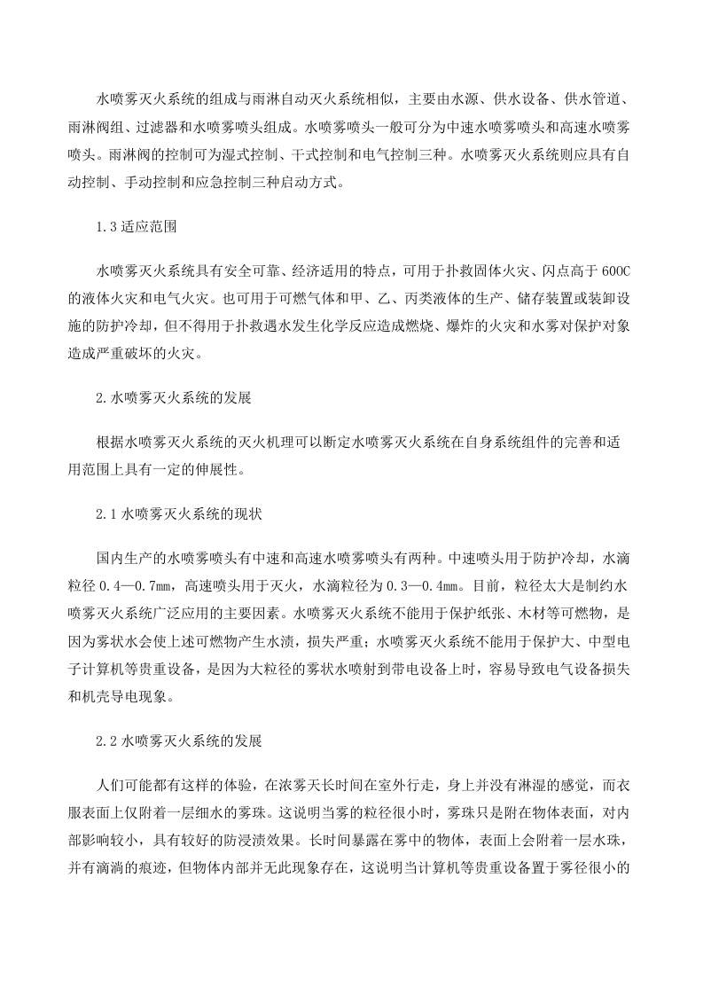 水喷雾灭火系统及其发展山东省建筑设计研究院刘洪令徐长岚王宗华提要本文简述了水喷雾灭火系统的灭火机理,系统组成和适用范围,根据水喷雾系统的现状,提出了发展设想,并就水喷雾灭火系统代替气体灭火系统的技术性问题进行了探讨。关键词水喷雾灭火系统雾径细雾喷头1.水喷雾灭火系统水喷雾灭火系统是利用水雾喷头在一定水压下将水流分解成细小水雾滴进行灭火或防护冷却的一种固定式灭火系统,是在自动喷水灭火系统的基础上发展起来的,具有投资小、操作方便、灭火效率高的特点。过去水喷雾灭火系统主要用于石化、交通和电力部门的消防系统中,随着大型民用建筑的发展,水喷雾灭火系统在民用建筑消防系统中的应用成为可能,在《高层民用建筑设计防火规范》(GB50045-95)1997年修订版中,第7.6.6.条明确规定,高层建筑内的可燃油油浸电力变压器室、充可燃油的高压电容器和多油开关室、自备发电机房和燃油、燃气锅炉房应设水喷雾灭火系统。1.1灭火机理水喷雾灭火系统的灭火机理主要为表面冷却,室息,冲击乳化和稀释。从水雾喷头喷出的雾状水滴,粒径细小,表面积很大,遇火后迅速汽化,带走大量的热量,使燃烧表面温度迅速降到燃点以下,使燃烧体达到冷却目的:当雾状水喷射到燃烧区遇热汽化后,形成比原体积大1700倍的水蒸汽,包围和覆盖在火焰周围,因燃烧体周围的氧浓度降低,使燃烧因缺氧而熄灭:对于不溶于水的可燃液体,雾状水冲击到液体表面并与其混合,形成不燃性的乳状液体层,从而使燃烧中断:对于水溶性液体火灾,由于雾状水能与水溶性液体很好溶合,使可燃烧性浓度降低,降低燃烧速度而熄灭。1.2系统组成