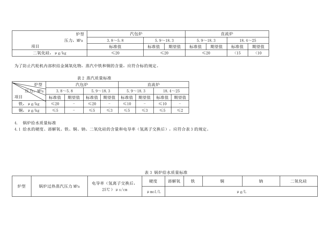 火力发电机组及蒸汽动力设备水汽质量GB/T12145-1999Quality criterion of water and steam for generating unit and steam power equipment1.范围本标准规定了火力发电机组和蒸汽动力设备在正常运行和停、备用机组启动时的水汽质量标准。本标准适用于锅炉出口压力为3.8Pa~25.0Pa(表大气压)的火力发电机组及蒸汽动力设备。2.引用标准下列标准所包含的条文,通过在本标准中引用而构成为本标准的条文。本标准出版时,所示标准均为有效。所有标准都会被修订,使用本标准的各方应探讨使用下列标准最新版本的可能性。GB/T7064-1996透平型同步电机的技术要求GBJ13-1986室外给水设计规范DL434-1991电厂化学水专业实施法定计量单位的有关规定DL/T561-1995火力发电厂水汽化学监督导则注:测试方法按国标进行3.蒸汽质量标准自然循环、强制循环汽包炉或直流炉的饱和蒸汽和过热蒸汽质量应符合表1的规定表1蒸汽质量标准炉型汽包炉直流炉压力,Pa3.85.85.9-18.35.9-18.318.4-25标准值标准值期望值标准值期望值标准值期望值磷酸盐处理」≤10钠,4g/kg≤15≤10≤5<5<3挥发性处理≤10≤5电导率(氢离子交磷酸盐处理≤0.30换后,25℃)4s/cm挥发性处理≤0.30≤0.30≤0.300.30中性水处理及联≤0.20≤0.15<0.20<0.15合水处理