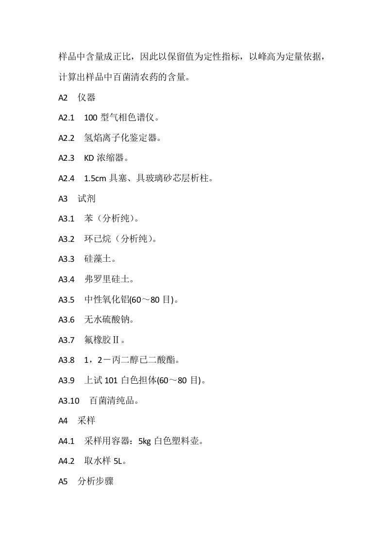 中华人民共和国国家标准GB11729一89水源水中百菌清卫生标准Hygienic standard for chlorothalonilein drinking water sources1主题内容与适用范围本标准规定了水源水中百菌清的最高容许浓度。本标准适用于生产和使用百菌清周围的生活饮用水源水,以及大面积喷洒百菌清森林地区的生活饮用水源水。2标准的限值水源水中百菌清卫生标准(最高容许浓度)为0.01mg/儿。3监测检验方法本标准采用气相色谱法监测水源水中百菌清,见附录A(补充件)。4标准的监督执行各级卫生防疫站或各级环境卫生监测站负责监督本标准的执行。A1原理百菌清农药在一定的色谱条件下,保留值不变,而出峰高度与该