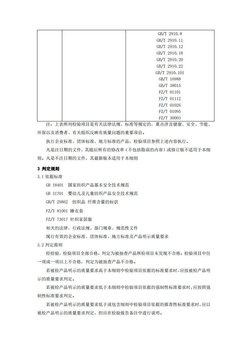 济南市睡衣居家服产品质量监督抽查实施细则(2025年版)1抽样1.1抽样方法以随机抽样的方式在被抽样生产者、销售者的待销产品中抽取。随机数一般可使用随机数表等方法产生。1.2抽样基数抽查样品基数满足抽样数量即可。1.3抽样数量每批次产品抽取样品2件/条/套,其中1件/条/套作为检验样品,1件/条/套作为备用样品。2检验依据表1睡衣居家服检验项目序号检验项目检测方法1甲醛含量GB/T2912.12pH值GB/T7573GB/T17592可分解致癌芳香胺染料GB/T233444耐水色牢度GB/T57136耐酸汗渍色牢度GB/T39226耐碱汗渍色牢度GB/T3922耐干摩擦色牢度GB/T3920FZ/T01057.1FZ/T01057.2FZ/T01057.3FZ/T01057.4GB/T2910.18纤维含量GB/T2910.2GB/T2910.3GB/T2910.4-2009或GB/T2910.4GB/T2910.6GB/T2910.7