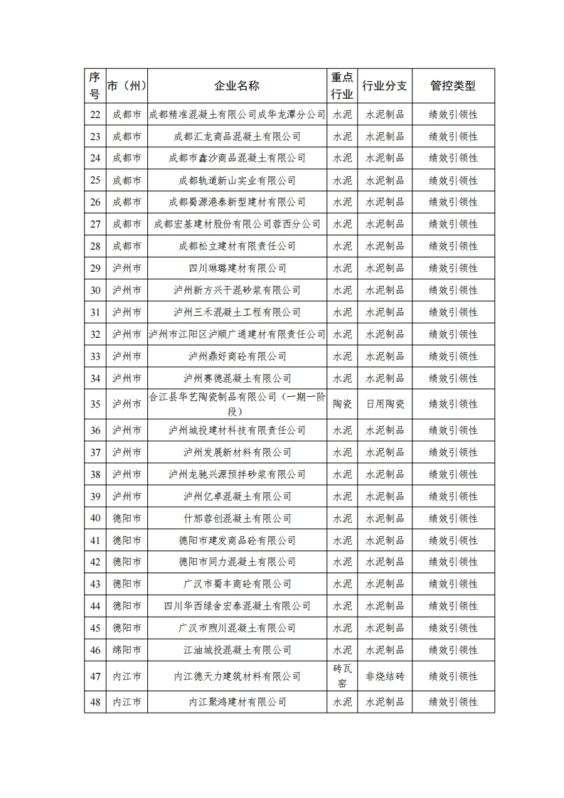 附件3四川省2022年第二批重污染天先债数评级债数引须性企业名单序市(州)企业名称重点行业分支管控类型号行业成都市成都宏基建材股份有限公司蓉东分公司水泥水泥制品绩效引领性2成都市四川瑞豪建材有限责任公司(高新站)水泥水泥制品绩效引领性3成都市成都精准混凝土有限公司双流分公司水泥水泥制品绩效引领性4成都市四川西建兴城建材有限公司水泥水泥制品绩效引领性成都市成都市西建三岔湖建材有限公司水泥水泥制品绩效引领性6成都市四川宏业商品混凝土有限公司水泥水泥制品绩效引领性成都市四川佰汇混凝土工程有限公司水泥水泥制品绩效引领性成都市成都建工赛利混凝土有限公司青白江分公水泥水泥制品绩效引领性司9成都市成都双鑫商品混凝土有限公司水泥水泥制品绩效引领性10成都市中建西部建设西南有限公司北新预拌厂水泥水泥制品绩效引领性11成都市成都建工赛利混凝土有限公司郫都分公司水泥水泥制品绩效引领性12成都市成都建工赛利混凝土有限公司新津分公司水泥水泥制品绩效引领性13成都市四川华西管桩柱工程有限公司水泥水泥制品绩效引领性成都市四川华西绿舍建材有限公司(金牛混凝土水泥水泥制品绩效引领性搅拌站)15成都市四川通德商品混凝土有限公司水泥水泥制品绩效引领性16成都市成都建工蓉睿建材有限公司水泥水泥制品绩效引领性17成都市成都兴远卓商品混凝土有限公司水泥水泥制品绩效引领性18成都市中冶蓉兴建材成都有限公司水泥水泥制品绩效引领性19成都市成都山峰混凝土工程有限公司水泥水泥制品绩效引领性20成都市成都建工赛利混凝土有限公司成华分公司水泥水泥制品绩效引领性成都市成都建工预筑科技有限公司成华分公司水泥水泥制品绩效引领性