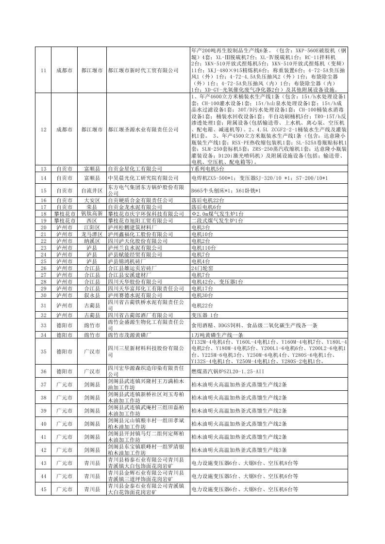 附件四川省2022年落后产能退出情况表序号市(州)县(市、区)企业名称生产线(设备)名称、规格型号及数量成都市郸都区成都壮达新材料有限公司SC-CPP/3500mm流延机生产线1条及相关附属设施设备。2成都市郸都区成都辰光亚克力塑胶有限公司年产能2000吨甲基丙烯酸甲酯裂解生产线1条,包括裂解炉48台电动葫芦5台、冷凝器48台及相关附属设施设备。年产800吨工业乙醛、无水乙醚生产线2条及相关附属设施设备成都市简阳市成都市宝隆乙醚加工厂冷却系统3套(KML6一100,冰机,板式冷却器7台),搪瓷反应罐4台,检测系统(GC112A气象色谱仪)1套,净水系统一套2台(CCT-3320,SHJMM).成都市彭州市彭州市鑫泰建材有限公司2座沸腾炉及相关附属设施3台1吨中烦炉及相关配套设施、除尘器3套、振动清砂生产线1条3714挂钩式地丸机2套、阀带式滚动抛丸机1套、砂轮机3套、螺杆式空压机及配套设施2套、自动射芯机4台、10吨桥架式双梁行车及附属物1套、5吨单梁行车及附属物3套、1000kVA变压器1台、1250kVA变压墨1台、80m3冷却循环池3个、50m3冷却循环5成都市彭州市彭州市通济镇明皓铸造池1个、高压配电柜及附属物2套、120m3沙库1套、12米提升机1套、沸腾冷却床(900*1600*850)1套、四级输送带1套、振动台2套、电器控制系统4套、模具型板4套、V法砂箱12套、震动造型机6台、工作平台118个、ERP自动控制生产线及附属设施2套、0806多触头铸型机2台、混砂机1台、100吨砂库1套、磁选输送线及配套设备2套、滚动式筛沙机1套、钻土砂输送线1条、55kW真空泵4套、砂箱134套、套箱180个、托盘600个、机井2套。2条1880造纸生产线及附属配套设备设施(真空泵,抽气量25m3、抽浆泵,流量80-100m3、推进器直径750、白水泵,流量200m3、电器柜4套):2.2台TP-T150SM抽取式纸巾包装机、2台6成都市崇州市成都居家生活造纸有限责任公司MJ系列盒装面巾机、2台FC200-2L面巾纸切纸机等及其附属设施设备(真空泵三叶鼓风机2台、切纸前端输送线<1.5米8条、2米2条>、切纸机后端输送线<1.5米6条、1.5米轨道10条>、单包机后端输送线<2米4条、2米轨道2条>等)。1.意大利CEFLAUV2000自动高光生产线带滚涂机和淋涂机2条及相关附属设施:2.德国豪迈(TBL100/KFL526)双端封边线1条及相关附属设施:3.宽幅异型砂光机3台、数控雌刻机1台、雕划机1台、高须热压机3台、背条钻孔机1台、六排钻1台、热熔胶贴面成都市崇州市明珠家具股份有限公司机1台、直线砂边机1台、直线式砂边机1台、双端铣1台、电子开料锯1台、全自动CNC加工中心1台、小型六排钻1台、背条攻牙机1台、双曲面异形砂4台、双平面(立面)抛光机2台、曲直倒角机1台、液压冷压机1台、冷压机1台、多功能表面砂光机3台、六排钻全自动1台、全自动七排钻1台、全自动多轴六排钻2台、异形砂边机2台。8成都市温江区成都众鑫达耐火材料有限公司高温窑炉1台(型号:8m3梭式窑)、300T刚玉匣钵生产线1条及相关附属设施。年产230吨陶土拉丝生产线2条(包含:18型拉丝机30台:锅炉架30个:锅炉托架5个:锅炉托脚30个:拉丝仪表30个:370W电机60个:3吨地磅秤2台,升降机及支架2套,振动筛2套:搓纱机,9成都市都江堰市都江堰市垠江玻璃纤维无捻粗纱络纱机F-89,10台:整经机1台:废丝粉碎机1台:织布机,GA747剑杆织机,4台:手动电动叉车E-20P,1台:台式钻床,4116A,1台:30吨水塔1座:烘房,16m,1间:消防水池2个:洗玻璃水池2个,药水回收池2个:拉丝筒7200个等)及附属设施设备。年产1500吨塑料编织袋生产线1条(包含:圆织机,直径80CM,54台:圆织机,直径150CM,3台:加粉机1台:拌料机1台:割钥管机1台:拉丝机,360cm,1套:造粒机1套:覆膜机,新型100,1套:覆膜机,老型140,1套:覆膜机,老型100,1套:印10成都市都江堰市成都市程泰包装有限公司刷折边切片一体机1套:手动印刷机1套:封袋机2台:裁缝一体机2台:裁缝套膜一体机1台:打边一体机1台:切缝牙口一体机,ZYZK80,2台:筒印机1台:翻袋机1台:空压机,15千瓦,1台:空压机,35千瓦,1台:彩印机1台:环评设备2套:烧烷机1台:破碎机,7.5KW,1台:930装载机1辆:打包机2台:打包机热熔胶封底机MS900,1台)及附属设施设备