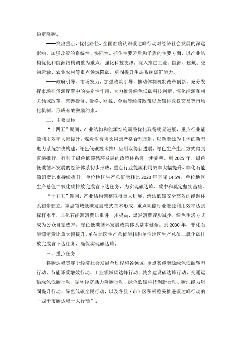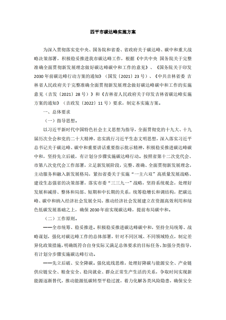 四平市碳达峰实施方案为深入贯彻落实党中央、国务院和省委、省政府关于碳达峰、碳中和重大战略决策部署,积极稳妥推进我市碳达峰工作,根据《中共中央国务院关于完整准确全面贯彻新发展理念做好碳达峰碳中和工作的意见》、《国务院关于印发2030年前碳达峰行动方案的通知》(国发〔2021)23号)、《中共吉林省委吉林省人民政府关于完整准确全面贯彻新发展理念做好碳达峰碳中和工作的实施意见(吉发〔2021)28号)》和《吉林省人民政府关于印发吉林省碳达峰实施方案的通知》(吉政发〔2022)11号)要求,制定本实施方案。一、总体要求(一)指导思想。以习近平新时代中国特色社会主义思想为指导,全面贯彻党的十九大、十九届历次全会和党的二十大精神,忠实践行习近平生态文明思想,深入落实习近平总书记关于碳达峰、碳中和重要讲话重要指示批示精神,积极稳妥推进碳达峰碳中和,坚持先立后破,有计划分步骤实施碳达峰行动。按照省第十二次党代会、市第八次党代会工作部署,立足新发展阶段,完整、准确、全面贯彻新发展理念,主动服务和融入新发展格局,紧扣省委关于实施“一主六双”高质量发展战略、建设生态强省的决策部署,落实市委“三三九一”战略,坚持系统观念,处理好发展和减排、整体和局部、短期和中长期的关系,统筹稳增长和调结构,把碳达峰、碳中和纳入经济社会发展全局,推动经济社会发展建立在资源高效利用和绿色低碳发展基础之上,确保2030年前实现碳达峰,提前布局碳中和。(二)工作原则。一一全市统筹、稳妥推进。积极稳妥推进碳达峰碳中和,坚持全局统筹、战略谋划,强化对碳达峰工作的总体部署,针对不同区域、不同领域特点,制定差异化政策措施,明确既符合自身实际又满足总体要求的目标任务,加强分类指导,有计划分步骤实施碳达峰行动。一一先立后破、安全降碳。强化底线思维,处理好降碳与能源安全、产业链供应链安全、粮食安全、稳岗就业、群众正常生产生活的关系,争取时间实现新能源逐渐替代,推动能源低碳转型平稳过渡,着力化解各类风险隐患,确保安全