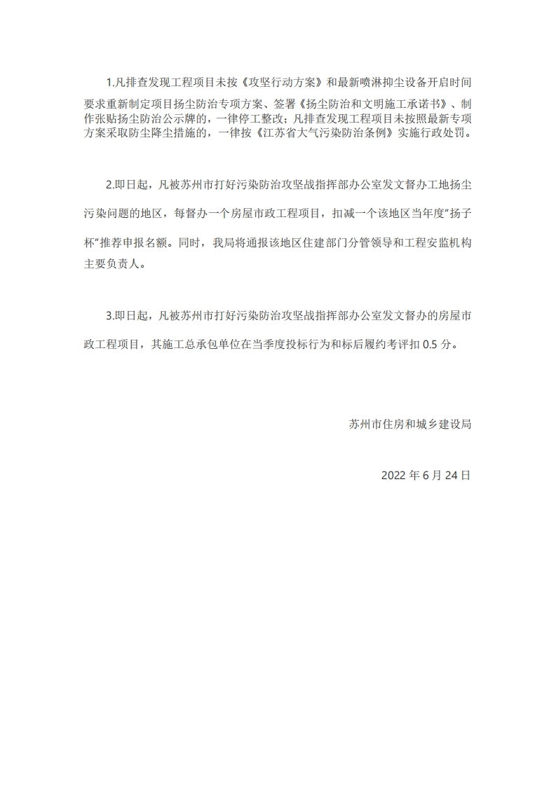 关于狠抓落实全面开展建筑工地扬尘污染排查治理的紧急通知各市、区住建局(委),苏州工业园区规建委:各有关单位:近期,我市部分工地扬尘污染问题有所反弹。为进一步推动我市房屋市政工程施工扬尘高标准防治,切实减少工地扬尘污染,经研究决定,组织开展房屋市政工程施工现场扬尘污染排查治理活动。现将有关事项通知如下:一、切实履职工程参建各方严格落实工地扬尘污染治理主体责任。建设单位对建设工程扬尘污染防治负总责:施工总承包单位对施工过程中的扬尘控制负主体责任:监理单位对施工现场扬尘控制负监理责任。6月30日前,在建房屋市政工程项目施工总承包单位全面完成自查自改的基础上,各地住建部门开展无死角、全覆盖“四不两直“的检查督查活动,确保施工现场扬尘污染问题全面整改到位。二、突出重点坚决落实《苏州市2022年建设工程扬尘污染防治攻坚行动方案》(以下简称《攻坚行动方案》)、《关于进一步明确工地喷淋抑尘设备开启时间相关事项的通知》关于工地周边全封闭围挡、裸土与物料堆放覆盖、土方开挖等湿法作业、路面与场地硬化、出入车辆有效清洗、渣土车辆密闭运输“六个百分之百“及远程视频在线监控、扬尘在线监测、喷淋洒水抑尘、非道路移动机械管控等十项工作措施。三、严格执法