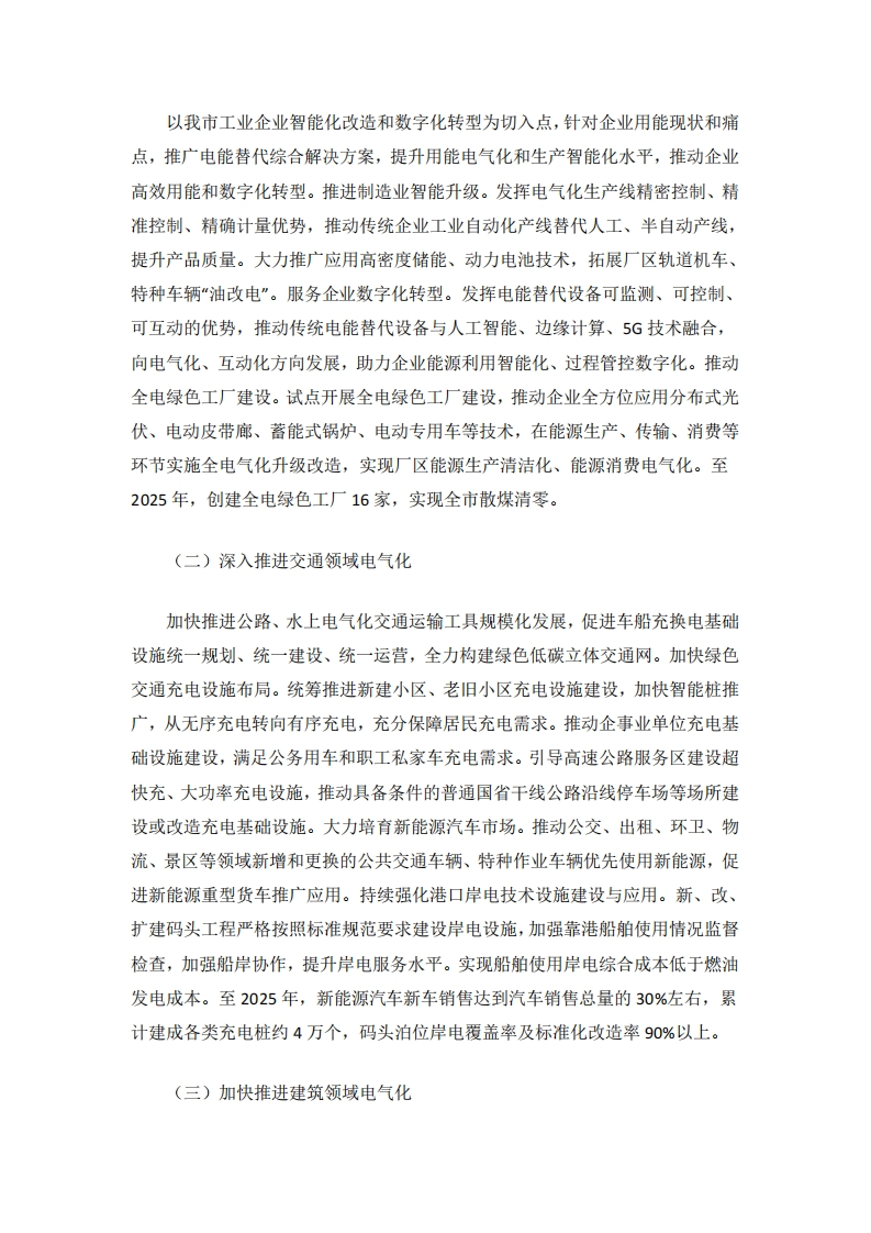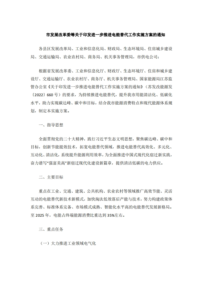 市发展改革委等关于印发进一步推进电能替代工作实施方案的通知各县区发展改革局、工业和信息化局、财政局、生态环境局、住房城乡建设局、交通运输局、农业农村局、商务局、机关事务管理局,市供电公司:根据省发展改革委、工业和信息化厅、财政厅、生态环境厅、住房和城乡建设厅、交通运输厅、农业农村厅、商务厅、机关事务管理局、国家能源局江苏监管办公室《关于印发进一步推进电能替代工作实施方案的通知》(苏发改能源发〔2022)660号)的要求,为持续推进电能替代,提升我市用能清洁化、低碳化水平,助力实现碳达峰、碳中和目标,结合我市能源消费特点和现代能源体系规划,制定本实施方案。一、指导思想全面贯彻党的二十大精神,践行习近平生态文明思想,聚焦碳达峰、碳中和目标,创新节能提效技术,拓宽电能替代领域,推进电能替代高效化、多元化、互动化、清洁化,系统提升能源利用效率,为全面推进中国式现代化宿迁新实践,奋力谱写“强富美高”新宿迁现代化建设新篇章,提供清洁低碳的电力供应。二、主要目标重点在工业、交通、建筑、公共机构、农业农村等领域推广高效节能、灵活互动的电能替代新技术新模式,加快淘汰低效落后产能与技术,努力构建政策体系完善、标准体系完备、市场模式成熟、智能化水平高的电能替代发展新格局。至2025年,电能占终端能源消费比重达到35%左右。三、重点任务(一)大力推进工业领域电气化