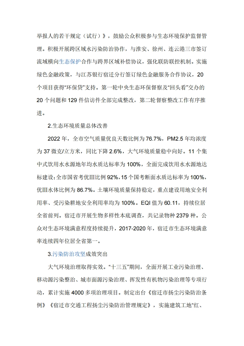 宿迁市生态文明建设规划(2023-2030年)第一章工作基础与形势分析一、建设基础(一)区域特征宿迁市位于江苏省西北部,地处淮海经济带、沿海经济带、沿江经济带交叉辐射区,区位优势明显。境内生态资源禀赋突出,有洪泽湖和骆马湖两大著名的淡水湖,京杭大运河、古黄河穿境而过,全市水域面积305余万亩,湿地保有量16.26万公顷。宿迁市文化底蕴深厚,是西楚霸王项羽和美人虞姬的故乡,知名的水乡、酒都、绿海和花城。(二)工作基础近年来,市委市政府深入贯彻党的历次全体代表大会精神,坚定践行习近平生态文明思想,牢固树立“绿水青山就是金山银山”理念,推动形成人与自然和谐发展现代化建设新格局。1.生态制度和环境治理体系日益健全扎实推进生态损害赔偿,建立党政领导干部生态环境损害责任追究制度,制定《宿迁市生态环境问题追责问责事项移送工作办法》,把“党政同责、一岗双责、失职问责、终身追责”制度落到实处。综合运用经济、法律、技术等手段,积极构建政府为主导、企业为主体、社会组织和公众共同参与的环境保护体系。出台《宿迁市主要污染物排污权交易操作规则(试行)》,构建以排污许可证制度为核心的环境管理体系。常态化推进环保信用评价,根据企业环保信用评价结果严格落实差别水电价和绿色信任保护政策。出台《宿迁市保护和奖励生态环境违法行为