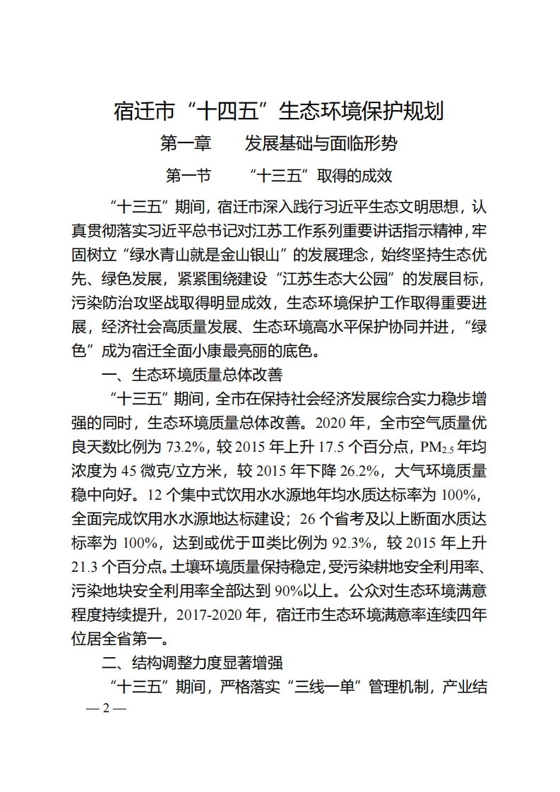宿迁市十四五生态环境保护规划348072@abc4个月前发布关注私信1.10MB85页025宿迁市十四五生态环境保护规划此内容为付费资源,请付费后查看¥13¥33黄金会员免费钻石会员免费立即购买您当前未登录!建议登陆后购买,可保存购买订单付费资源 第1页 / 共85页 第2页 / 共85页 试读已结束,还剩83页,您可下载完整版后进行离线阅读 THE END标准规范 文本预览 宿政办发〔2021〕61号市政府办公室关于印发宿迁市”十四五”生态环境保护规划的通知各县、区人民政府,市各开发区、新区、园区管委会,市各有关部门和单位:《宿迁市“十四五生态环境保护规划》已经市政府五届八十四次常务会议审议通过,现印发给你们,请认真贯彻落实。宿迁市人民政府办公室2021年12月31日(此件公开发布)1 查看更多 收起部分 喜欢就支持一下吧收藏
