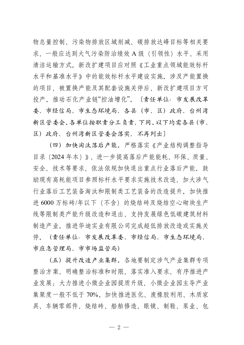 台州市空气质量持续改善行动计划(征求意见稿)为持续深入打好蓝天保卫战,切实保障人民群众身体健康,以高水平保护支撑高质量发展,根据《国务院关于印发<空气质量持续改善行动计划>的通知》(国发[2023]24号)和《浙江省空气质量持续改善行动计划》(浙政发[2024]11号)等文件精神,结合台州实际,制定本行动计划。一、总体要求(一)指导思想。深入贯彻习近平生态文明思想,聚焦推动高质量发展和解决人民群众身边的突出大气问题,以降低细颗粒物(PM25)浓度为主线,坚持精准、科学、依法治污,积极推动生态环境领域大规模设备更新,深入推进产业、能源、交通结构绿色低碳转型,集中开展大气治理攻坚行动,加快形成绿色低碳生产生活方式。(二)指标目标。到2025年,台州城市PM25平均浓度达到22微克/立方米,空气质量继续保持全国168个重点城市前列,全面消除重度及以上污染天气,完成省下达的氮氧化物(NOx)和挥发性有机物(VOCs)减排目标。二、优化产业结构,加快产业绿色转型升级(三)严控“两高一低”行业发展。坚决遏制“两高一低”(高耗能、高排放、低水平)项目盲目上马,新改扩建“两高一低”项目严格落实国家产业规划、产业政策、生态环境分区管控方案、规划环评、项目环评、节能审查、产能置换、重点污染