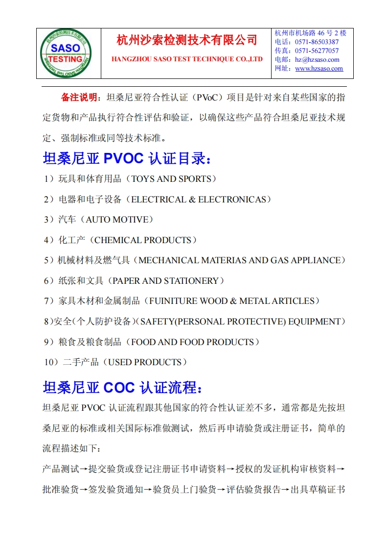 杭州市机场路46号2楼杭州沙索检测技术有限公司电话:0571-86503387SASO传真:0571-56277057TESTINGHANGZHOU SASO TEST TECHNIQUE CO.,LTD电邮:hz@hzsaso.com网址:www.hzsaso.com坦桑尼亚PVOC认证操作指南(杭州沙索检测技术有限公司邹老师编译)坦桑尼亚PVOC认证背景:坦桑尼亚是联合国宣布的世界最不发达的国家之一,但是近年来坦桑尼亚政局比较稳定,所以吸引了大量的国际投资,经济增长率一直居东部非洲之首,其中初级农副产品加工占了坦桑尼亚比较大的经济比重,而其他日常所需的工业品,如:仪器、饮料、机械设备、金属制品、日用品、交通运输工具、石油等产品,则大部分以进口为主。因此,坦桑尼亚国际间的贸易也就相对比较频繁,在这种背景下,为了确保坦桑尼亚消费者使用安全和合格的产品,以及保护本地生产制造商远离不公平竞争,坦桑尼亚政府于2010年初就开始着手产品认证计划,并指定坦桑尼亚标准局(TBS)负责制定和执行进口产品和国产产品的标准。在经过一段时间的酝酿后,坦桑尼亚政府的法定部门--坦桑尼亚标准局(TBS)便开始发布通告,从2012年2月1日开始执行出口前符合性认证(PVoC)项目。同时有180天的过渡期。于2012年8月1日正式严格执行PVOC认证制度。凡是列入PVOC管制目录内的产品如果没有取得符合性COC清关证书,贸易商将被处以货值的15%的罚款,并执行目的港检验,如果目的港检验不合格的产品,将被拒绝入境,执行退运或就地销毁。这就是坦桑尼亚PVOC认证的实施背景。