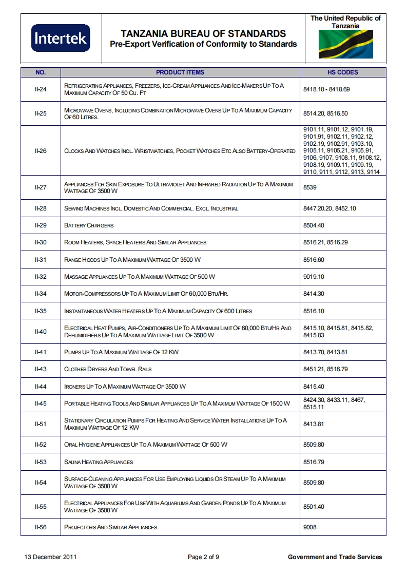 The United Republic ofTanzaniaIntertekTANZANIA BUREAU OF STANDARDSPre-Export Verification of Conformity to StandardsPRODUCTS SUBJECT TO TANZANIA PVoC PROGRAMMEGROUPI-TOYSNO.PRODUCT ITEMSHS CODES-01TOYS,INCL.VIDEO GAMES AND OTHER ELECTRONIC TOYS,DOLLS,TRICYCLES,NON ELECTRICMUSICAL INSTRUMENTS AND THE LIKE9501,9502,9503-02GYMNASIUM,FITNESS AND HEALTH RELATED PRODUCTS.9506.91-03BABY TROLLEY ANDOTHER RELATED PRODUCTS INCL.BABY CRIB.BABY ROCKER8715-04SPORTS,OUTDOOR GAMES AND OTHER RECREATION RELATED PRODUCTS9503.9506EXCL:9506.91).9507GROUP II-ELECTRICAL AND ELECTRONICSNO.PRODUCT ITEMSHS CODES8518.8519.8520.8521.8522-01AUDIO,VIDEO(INCL COMBINED FUNCTION)AND SIMILAR ELECTRONIC APPLIANCES INCL.MUSICAL8523.8524.8525.20.8525.30,INSTRUMENTS8527.9008.9207I-02VACUUM CLEANERS AND WATER-SUCTION CLEANING APPLIANCES UP TOA MAXIMUMWATTAGE8509.10.8509.20,8509.80,OF3500 W8509.90.8508I-03ELECTRIC IRONS UP TOA MAXIMUM WATTAGE OF 3500 W8516.40I-04SPIN EXTRACTORS UP TOA MAXIMUM CAPACITY OF 12 KG8451.90-05DISHWASHERS UP TO A MAXIMUM WATTAGE OF 3500 W8422.11.8422.19-06STATIONARY COOKING RANGES,HOBS,OVENS AND SIMILAR APPLANCES8419.81.8514.20.8516.60-07WASHING MACHINES UP TOA MAXIMUM CAPACITY OF 12 KG8450-08SHAVERS.HAIR CLIPPERS AND SIMILAR APPLIANCES UP TOA MAXIMUMWATTAGE OF 500 W8510.10.8510.20I-09GRILLS,TOASTERS AND SIMILAR PORTABLE COOKING APPLIANCES8516.72.8516.79I-10FLOOR TREATMENT MACHINES AND WET SCRUBBING MACHINES8509.80-11TUMBLE DRYERS UP TOA MAXIMUM CAPACITY OF 12 KG8451.21l-12WARMING PLATES AND SIMILAR APPLANCES8516.79-13DEEP FATFRYERS,FRYING PANS AND SIMILAR APPUANCES8419.81.8514.20.8516I-14KITCHEN MACHINES8509I-15APPLIANCES FOR HEATING LIQUIDS UP TOA MAXIMUM WATTAGE OF 3500 W8516.71-16FOOD WASTE DISPOSERS UP TOA MAXIMUM WATTAGE OF 3500 W8509.30-17BLANKETS,PADS AND SIMILAR FLEXIBLE HEATING APPLIANCES UP TOA MAXIMUM WATTAGE OF3500W6301.10.6406.99.8516.79-21STORAGE WATER HEATERS UP TOA MAXIMUM CAPACITY OF600 LITRES ANDSIMILAR ELECTRO8516.10THERMIC APPLIANCES-23APPLIANCES FOR SKIN OR HAIR CARE(INCL.MANICURETOOLS,CURUNG COMBS,CURLING8516.32IRONS,ROLERS,FACIAL SAUNAS ETC)UP TO A MAXIMUMWATTAGE OF 3500W13 December 2011Page 1 of 9Government and Trade Services
