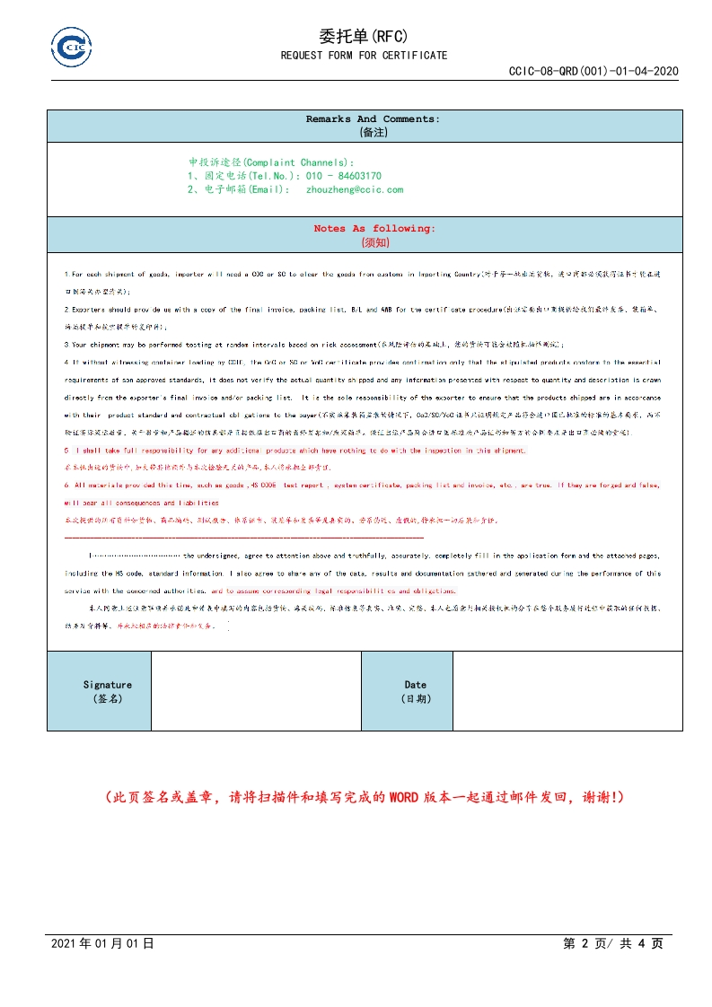 委托单(RFC)REQUEST FORM FOR CERTIFICATEC01C-08-QRD(001)-01-04-2020IMPORTING COUNTRY(进口国别)CCIC REF.NO.(指令号)(由CCIC填写)Date(日期)KENYA(肯尼亚)。NIGERIA(尼日利亚)。TANZANIA(坦桑尼亚)EGYPT(埃及)。BOTSWANA(博茨瓦钠)。ZNZIBAR(桑给巴尔)2022-IRAN(伊朗)。COTE D'LVOIRE(科特迪瓦)n0 thers(其他)The Type of Certificate Applied For(所中请证书类型)Product Certificate1(Unregistered)Pc1(朱注册状态产品证书)(尼日利亚-产品证书)Product Certificate2(Registered)PC2(注册状态产品证书)(尼日利亚-产品注册证书)Product Certificate 3(Licenced)P03(许可状态产品证书)(尼日利亚-产品许可证书)Registration Certificate(坦桑尼亚、肯尼亚-产品注册证)口License Certificate(坦桑尼亚、肯尼亚-产品许可证)口CoC(坦桑尼亚、肯尼亚、博茨瓦钠-符合性证书)口SC(尼日利亚S0NCAP证书)口VoC(埃及-符合性证书)口C0I(检验证书)Exporter Details(出口商信息)Name/名称ddress/地址Contact Person:(联系人)Telephone:(联系电话)Fax:(联系传真)E-Mail:(联系电邮)Importer Details(进口商信息)Name/名称ddress/.地址Contact Person:(联系人)Telephone:(联系电话)Fax:(联系传真)E-Mail:(联系电邮)Booking Inspection(预约检验)Remark:All Goods Should Be Concentrated One Same Place For Test Inspection(备注:所有货物必须集中到一个所在地测试和检验)Date&Time:(时间)Contact Person:(联系人)Goods of Location:(地,点)Telephone:(联系电话)Shipment Details(出运信息)Remark:For Certificate of Conformity Request(中请CoC/SC/VoC/C0l证书,请埃写)Country of Origin(原产国)Packages/Qty(包装及数量)Port of Loading(出运港)】Port of Discharge(印货港)口Air(空运)口Sea(海运)Expected Shipment Date口FCL(整柜)(预期出运日期)Mode of Transport(出运方式)口Sup.Of Loading(监皆装柜)oPart-x20"/x40"Partial Shipment Status(第几批出运)(分批出运状况)口LCL(散装)口Total(整批出运)口Final(最终出运)Import License No.Final Invoice No.Dated(发票号码/目期)(进口许可证号码)(仅限肯尼亚业务)Documents With This Request:(所附文件资料)Valid Test Report/Test CertificateSuppliers Declaration Of Confirm(有效测试报告/证书)(供应商声明)Copy Of IS0 QMS Certification(IS 9001,Product Specification Sheet,MSDS(IS0质量认证等体系复印件)(产品规格表,村质安全数据表)Factory Inspection/Test ReportPhotographs Of Products(厂检/测试报告)(产品图片)Invoice(发桑)口Packing List(装箱单)B/L or AWB(提单)aL/C(If Any,,如有)thers,,Please Specify(其他,请说明):(双击复选框,选中需要勾选的项目,请勿以颜色标记,谢谢!)2021年01月01日第1页/共4页