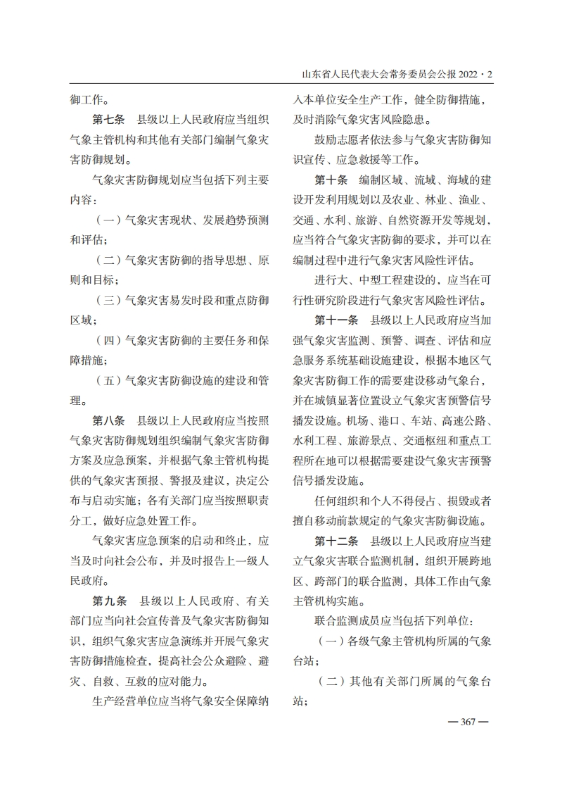 山东省人民代表大会常务委员会公报2022·2山东省气象灾害防御条例2005年7月29日山东省第十届人民代表大会常务委员会第十五次会议通过根据2012年1月13日山东省第十一届人民代表大会常务委员会第二十八次会议《关于修改(山东省环境噪声污染防治条例〉等二十五件地方性法规的决定》第一次修正根据2018年1月23日山东省第十二届人民代表大会常务委员会第三十五次会议《关于修改〈山东省机动车排气污染防治条例〉等十四件地方性法规的决定》第二次修正根据2022年3月30日山东省第十三届人民代表大会常务委员会第三十四次会议《关于修改〈山东省机动车排气污染防治条例〉等四件地方性法规的决定》第三次修正第一条为了防御气象灾害,保障人用其规定。民生命和财产安全,促进经济和社会发展,第四条气象灾害防御工作,应当遵根据《中华人民共和国气象法》及有关法循预防为主、防治结合、统筹规划、分级律、行政法规,结合本省实际,制定本条例。负责的原则。第二条本条例所称气象灾害,包括第五条县级以上人民政府应当加强天气、气候灾害和气象次生、衍生灾害。气象灾害防御工作的领导,组织开展气象天气、气候灾害,是指因台风(热带灾害防御法律法规和科技知识的宣传、普风暴、强热带风暴)、暴雨(雪)、雷暴、及,支持气象灾害防御的科学研究,将气冰雹、大风、沙尘、龙卷风、大(浓)雾、象灾害防御工作纳入国民经济和社会发展高温、低温、连阴雨、冻雨、霜冻、结(积)规划,并将所需资金纳人本级财政预算。冰、寒潮、干旱、干热风、热浪、洪涝、第六条县级以上气象主管机构负责积涝等因素直接造成的灾害。气象灾害的监测、预报、预警,组织开展气象次生、衍生灾害,是指因气象因人工影响天气作业,按照职责分工做好雷素引起的山体滑坡、泥石流、风暴潮、森电灾害防御工作。林火灾等灾害。应急管理、农业农村、水利、生态环第三条在本省行政区域及管辖海境、自然资源、住房城乡建设、民政、交域内从事气象灾害防御活动的,应当遵通运输、通信、文化和旅游、海洋等有关守本条例;法律、法规另有规定的,适部门按照职责分工做好相关的气象灾害防—366—