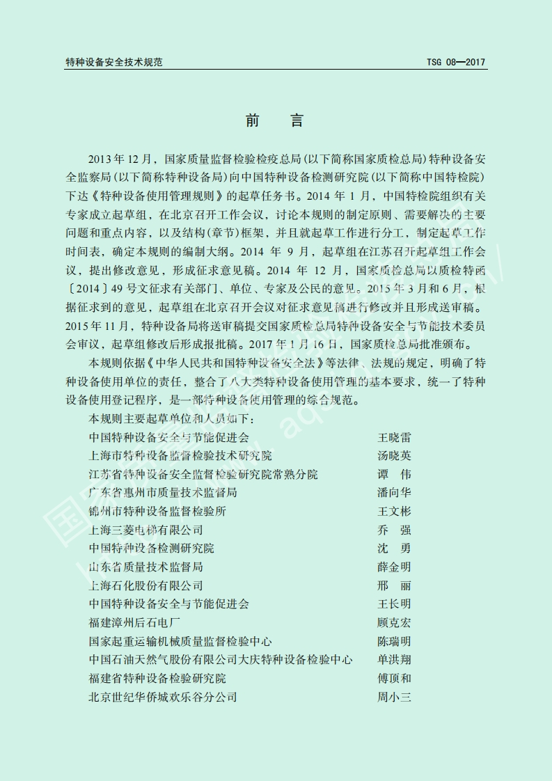特种设备使用管理规则348072@abc4个月前发布关注私信0.62MB46页024特种设备使用管理规则此内容为付费资源,请付费后查看¥13¥33黄金会员免费钻石会员免费立即购买您当前未登录!建议登陆后购买,可保存购买订单付费资源 第1页 / 共46页 第2页 / 共46页 试读已结束,还剩44页,您可下载完整版后进行离线阅读 THE END标准规范 文本预览 TSG特种设备安全技术规范TSG08-2017特种设备使用管理规则Special Equipment Service Administration Regulation中华人民共和国国家质量监督检验检疫总局颁布2017年1月16日 查看更多 收起部分 喜欢就支持一下吧收藏