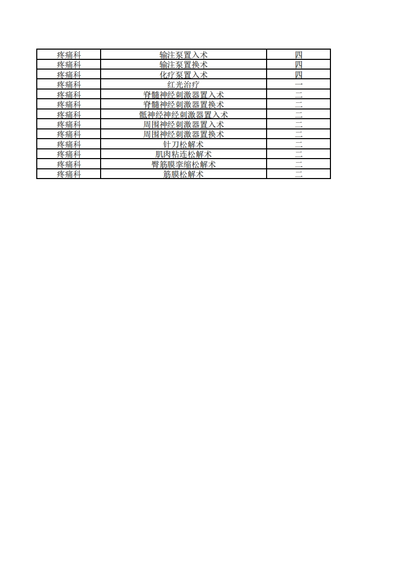 疼痛科手术分级管理目录科室名称手术操作名称手术级别疼痛科椎管内破坏性药物注射疼痛科椎管内无水酒精注射疼痛科椎管的导管置入,为治疗性或姑息治疗性药物的输注三疼痛科连续硬膜外阻滞术三疼痛科为镇痛的椎管麻醉药注射三疼痛科椎管内止痛剂注入术三疼痛科椎管内置管止痛术三疼痛科脊神经根阻滞术三疼痛科椎管其他药物的注射疼痛科椎管内注射封闭疼痛科椎管内注射化疗药物三疼痛科椎管内注射药物治疗三疼痛科脊髓蛛网膜下腔注射术三疼痛科脊髓鞘内注射三疼痛科脊髓神经刺激器导线置入或置换四疼痛科颅和周围神经和神经节的其他诊断性操作三疼痛科顿和周围神经的破坏术三疼痛科经皮腹腔神经丛射频消融术四疼痛科经皮穿刺颈交感神经节毁损术三疼痛科经皮穿刺腰交感神经节毁损术四疼痛科经皮穿刺腹腔神经丛毁损术四疼痛科CT引导下腰交感神经射频消融术四疼痛科颅神经破坏术三疼痛科周围神经破坏术三疼痛科周围神经烧灼术三疼痛科脊神经破坏术三疼痛科脊髓神经根射频消融术四疼痛科三叉神经射频消融术四疼痛科三叉神经半月节射频热凝术四疼痛科翼腭神经节破坏术三疼痛科肋间神经射频消融术四疼痛科内脏神经无水酒精注射术三疼痛科麻醉药交感神经注射,为了镇痛四疼痛科星状神经节阻滞术四疼痛科腹腔神经节阻滞术疼痛科脊神经丛阻滞术四疼痛科腹腔无水酒精神经阻滞术四疼痛科脊髓神经刺激器去除术疼痛科骶神经电刺激器取出术一疼痛科皮下神经刺激器去除疼痛科皮肤组织扩张器取出术疼痛科完全可植入型的输注泵置入四疼痛科药物治疗泵置入四