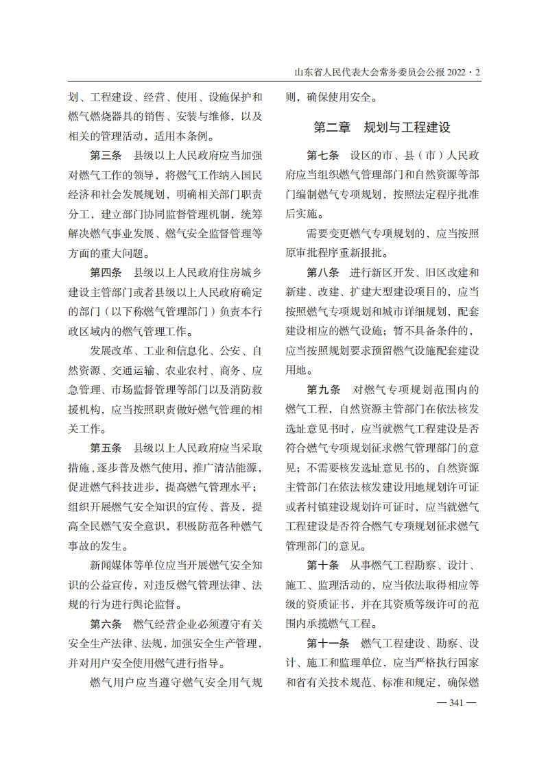 山东省燃气管理条例2003年9月26日山东省第十届人民代表大会常务委员会第四次会议通过根据2015年7月24日山东省第十二届人民代表大会常务委员会第十五次会议《关于修改〈山东省农村可再生资源条例〉等十二件地方性法规的决定》第一次修正根据2016年3月30日山东省第十二届人民代表大会常务委员会第二十次会议《关于修改〈山东省海洋环境保护条例〉等九件地方性法规的决定》第二次修正根据2022年3月30日山东省第十三届人民代表大会常务委员会第三十四次会议《关于修改〈山东省燃气管理条例》的决定》第三次修正第八章附则目录第一章总则第一章总则第二章规划与工程建设第一条为了加强城乡燃气管理,保第三章经营管理障人民生命财产安全和社会公共安全,维第四章使用管理护燃气用户和燃气经营企业的合法权益,第五章设施与器具管理根据有关法律、行政法规,结合本省实际,第六章监督检查与事故处理制定本条例。第七章法律责任第二条本省行政区域内燃气的规-340