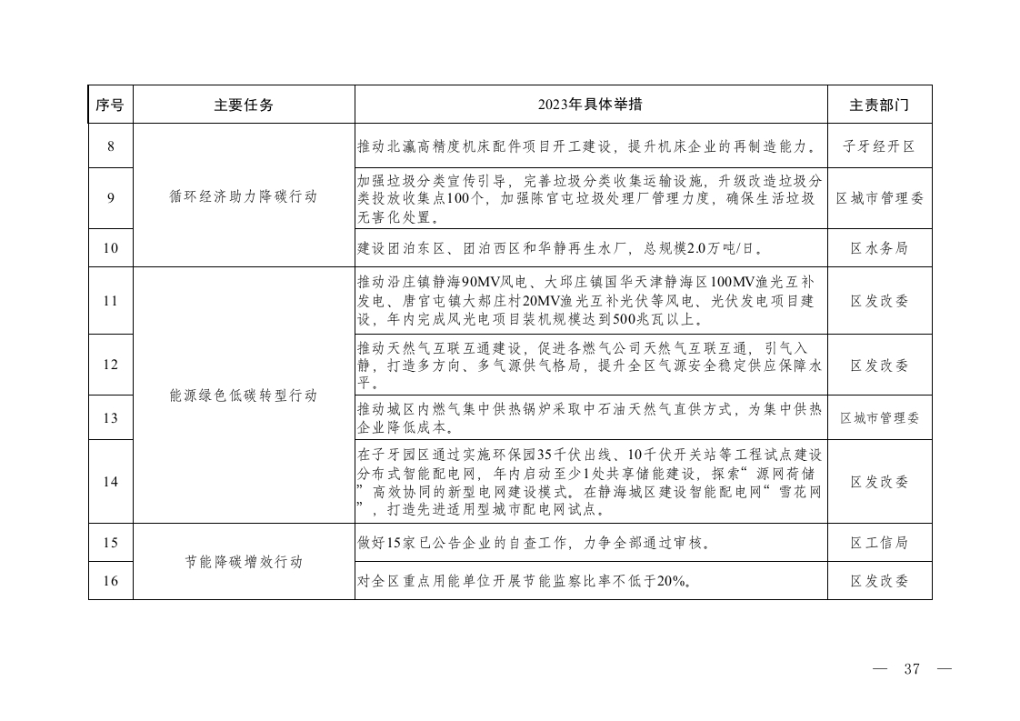 附件天津市静海区2023年碳达峰工作任务分工序号主要任务2023年具体举措主责部门推动新一代信息技术为产业发展赋能,支持爱玛科技、欧派家居等重点1企业开展智能化、信息化、绿色化改造,建成数字车间、智能工厂和绿区工信局色工厂6个.推动龙创恒盛、海纳创为、民祥药业、赛德生物、耀德航空等重点战新产业项目建设。区工信局工业绿色低碳转型行动推进天丰轧三地块“大邱庄智造谷”建设,推动天津浙商(静海)高新产业园、浙商博通智造园等一批重大目标项目建设。大邱庄镇政府推动台玻天津玻璃有限公司绿色化改造项目,对浮法玻璃生产线进行节4能化冷修改造,主要进行窑炉的重新修筑,更换生产线节能电机与节能灯,力争上半年完成改造。改造完成后,生产能耗降低5%,能源成本区工信局减少5%.5年内与正威集团合作建成国际大宗商品(循环经济)交易总部基地,打造供应链区域总部。子牙经开区推动格林美新能源动力蓄电池回收再制造及循环利用项目年内开工建6循环经济助力降碳行动设,天时力锂离子电池封装制造及回收梯次利用项目竣工投产,构建动子牙经开区力电池研发、制造、回收、拆解和梯次利用的全产业链。推动TCL奥博废弃资源循环利用项目(三期)竣工投产,拉长传统再生资源产业链长度.子牙经开区36