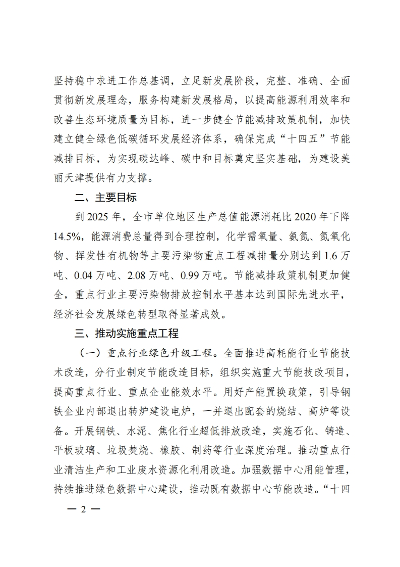 天津市人民政府关于印发天津市“十四五”节能减排工作实施方案的通知各区人民政府,市政府各委、办、局:现将《天津市“十四五”节能减排工作实施方案》印发给你们,望遵照执行。天津市人民政府2022年5月8日(本文有删减)天津市“十四五”节能减排工作实施方案为认真贯彻落实党中央、国务院重大决策部署,大力推动节能减排,深入打好污染防治攻坚战,推进经济社会发展全面绿色转型,根据《国务院关于印发“十四五”节能减排综合工作方案的通知》(国发〔2021)33号),结合本市实际,制定本方案。一、总体要求以习近平新时代中国特色社会主义思想为指导,全面贯彻党的十九大和十九届历次全会精神,深入贯彻习近平生态文明思想,