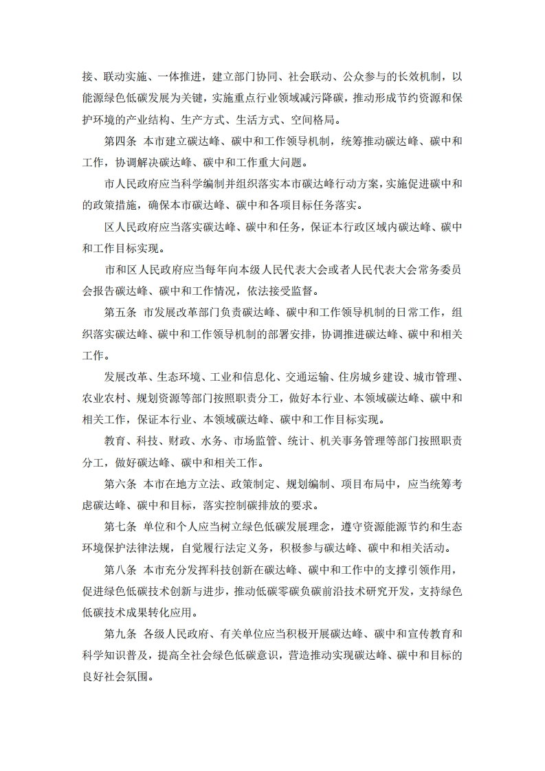 天津市碳达峰碳中和促进条例(2021年9月27日天津市第十七届人民代表大会常务委员会第二十九次会议通过)目录第一章总则第二章基本管理制度第三章绿色转型第一节调整能源结构第二节推进产业转型第三节促进低碳生活第四章降碳增汇第一节减少碳排放第二节增加碳汇第五章科技创新第六章激励措施第七章法律责任第八章附则第一章总则第一条为了促进实现碳达峰、碳中和目标,推动经济社会发展全面绿色转型,推进生态文明建设,根据有关法律、行政法规,结合本市实际,制定本条例。第二条本条例适用于本市行政区域内促进实现碳达峰、碳中和目标的相关活动。第三条本市促进实现碳达峰、碳中和目标,应当坚持“全国统筹、节约优先、双轮驱动、内外畅通、防范风险”的原则,实行碳达峰、碳中和目标有效衔