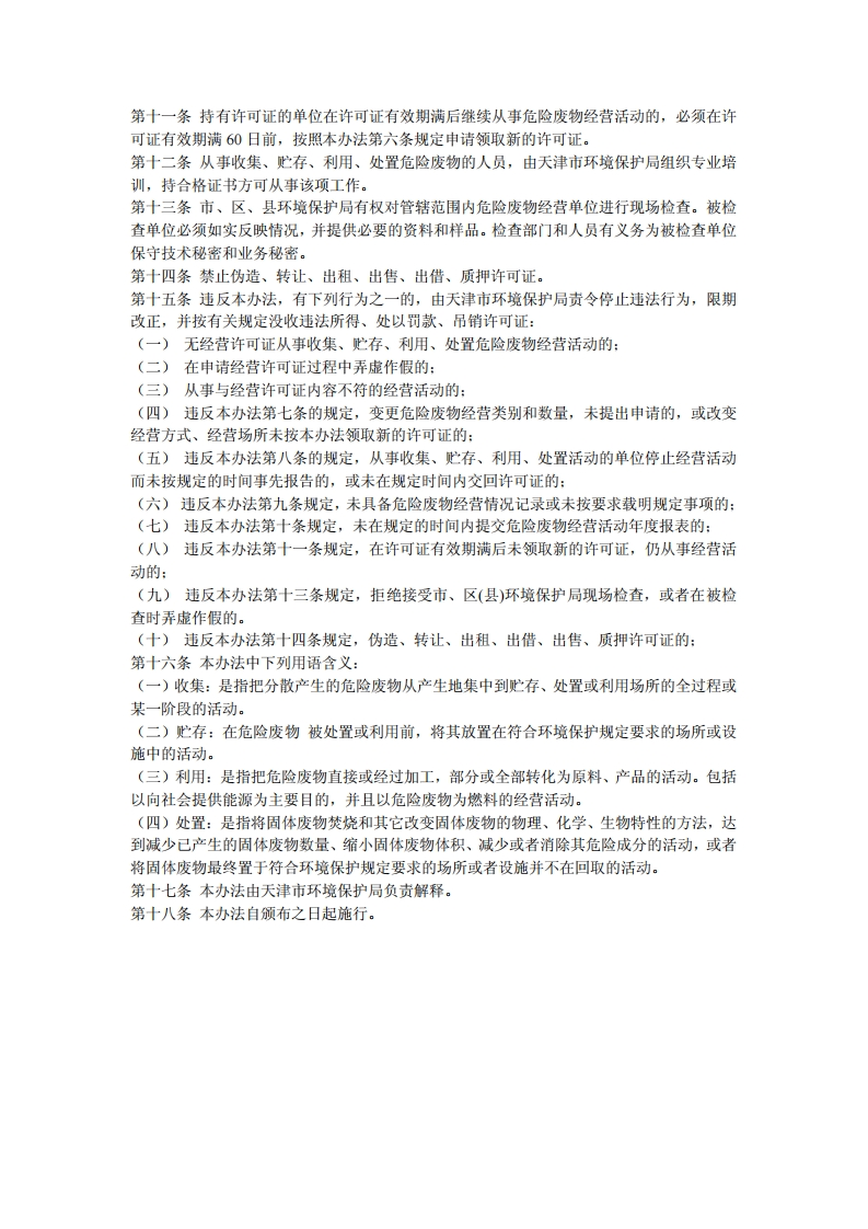 天津市危险废物经营许可证管理办法第一条为了加强对我市危险废物的收集、贮存、利用、处置活动的管理,防止危险废物污染环境,根据《中华人民共和国固体废物污染环境防治法》和《天津市危险废物污染环境防治办法》的有关规定,结合本市实际,制定本办法。第二条在本市行政区域内从事收集、贮存、利用、处置危险废物经营活动的单位,必须遵守本办法。第三条天津市环境保护局对本市危险废物经营许可证(以下简称许可证)实施统一监督管理。第四条从事收集、贮存、利用、处置本市行政区域内的危险废物经营活动的单位,必须到天津市环境保护局申请许可证。第五条申请许可证的单位,应当是依法成立具有法人资格的企业,并具备与其申请经营项目相适应的下列条件:(一)收集、贮存、利用、处置危险废物的资金、场所、技术、设施:(二)专业技术人员:(三)污染防治能力:(四)预防和处理经营活动中发生的污染事故和其他突发性事件的能力。第六条申请许可证的程序:(一)、申请许可证的单位应当向天津市环境保护局领取并填报许可证申请表(一式二份),并提交下列材料(一式二份):1、企业法人营业执照副本(复印件):2、贮存、利用、处置设施的建设项目环境保护验收材料。3、申请单位委托具有环境风险评估资质的单位出具的收集、贮存、利用、处置危险废物活动环境风险评估报告书(表)。(二)、天津市环境保护局在收到申请材料之日起45日内做出审批决定,对合格的单位颁发许可证。许可证的有效期为3年。天津市环境保护局将对持有许可证单位进行年度审核。第七条持有许可证的单位经营危险废物的类别和数量发生变更的,应于3个月内向天津市环境保护局办理变更手续。天津市环境保护局接到持证单位变更申请之日起45日内对变更申请做出审批决定:变更申请被批准的,由天津市环境保护局收回原许可证,颁发变更后的许可证。变更后的许可证有效期不超过原许可证的截止日期。持有许可证的单位改变经营方式、经营场所的,应当按本办法第六条的规定申请领取新的许可证。第八条持有许可证的单位关闭、停产、停业、转产、合并的,应当在停止经营活动6个月之前向天津市环境保护局提交终止经营报告,终止经营报告应当包括防止危险废物流失、防止对经营设施所在地环境造成污染、防止无关人员进入经营设施的计划、措施和资金安排及终止经营活动的时间。并在停止经营活动之日起7日内,将许可证交回天津市环境保护局。第九条持有许可证的单位必须建立危险废物经营情况记录,载明每日收集、贮存、利用、处置危险废物的类别、数量、危险废物的最终去向、有无事故或其他异常情况等。第十条持有许可证的单位必须在每年三月前向天津市环境保护局提交上一年度危险废物经营活动年度报表,同时抄报经营设施所在地区、县环境保护局。