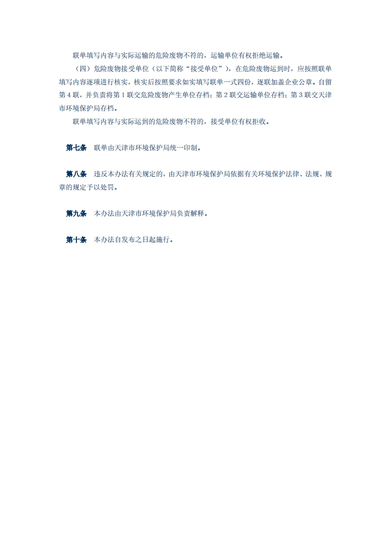 天津市危险废物转移联单实施细则天津市环境保护局(2001年7月16日)第一条为加强对危险废物转移的有效监督,根据《中华人民共和国固体废物污染环境防治法》、《天津市危险废物污染防治管理办法》、《危险废物转移联单管理办法》(国家环境保护总局第5号)的有关规定,结合本市实际,制定本实施细则。第二条本细则适用于在本市辖区内从事危险废物转移活动的单位。将危险废物移入或移出本市的,按照国家有关规定执行。第三条天津市环境保护局对本市危险废物转移联单(以下简称联单)实施监督管理。天津市工业废物交换中心具体负责联单实施过程中的技术性、事务性工作。第四条危险废物产生单位应当在每年11月15日之前向所在地区、县环境保护局提交下一年度危险废物转移申请书(一式三份),区、县环境保护局接到申请书之日起10日内对其进行审核,签署意见后报天津市环境保护局,天津市环境保护局在每年年度前作出审批决定。天津市环境保护局的审批以书面形式通知申请单位并抄送申请单位所在地区、县环境保护局。危险废物转移申请书由天津市环境保护局统一制订。第五条危险废物产生单位不得擅自转移未经天津市环境保护局批准转移的危险废物。第六条联单的运作程序:(一)危险废物产生单位持批准的危险废物转移申请书到天津市环境保护局办理领取联单手续。(二)危险废物产生单位在每次转移危险废物时,应如实填写联单一式五份,逐联加盖企业公章,其中第5联自留,其余四联交给危险废物运输单位(以下简称“运输单位”),随危险废物转移运行。(三)运输单位在运输危险废物时,应按照危险废物产生单位所填联单内容逐项核实所运输的危险废物,核实后按照要求如实填写联单一式四份,并负责将联单随同危险废物交付接受单位。