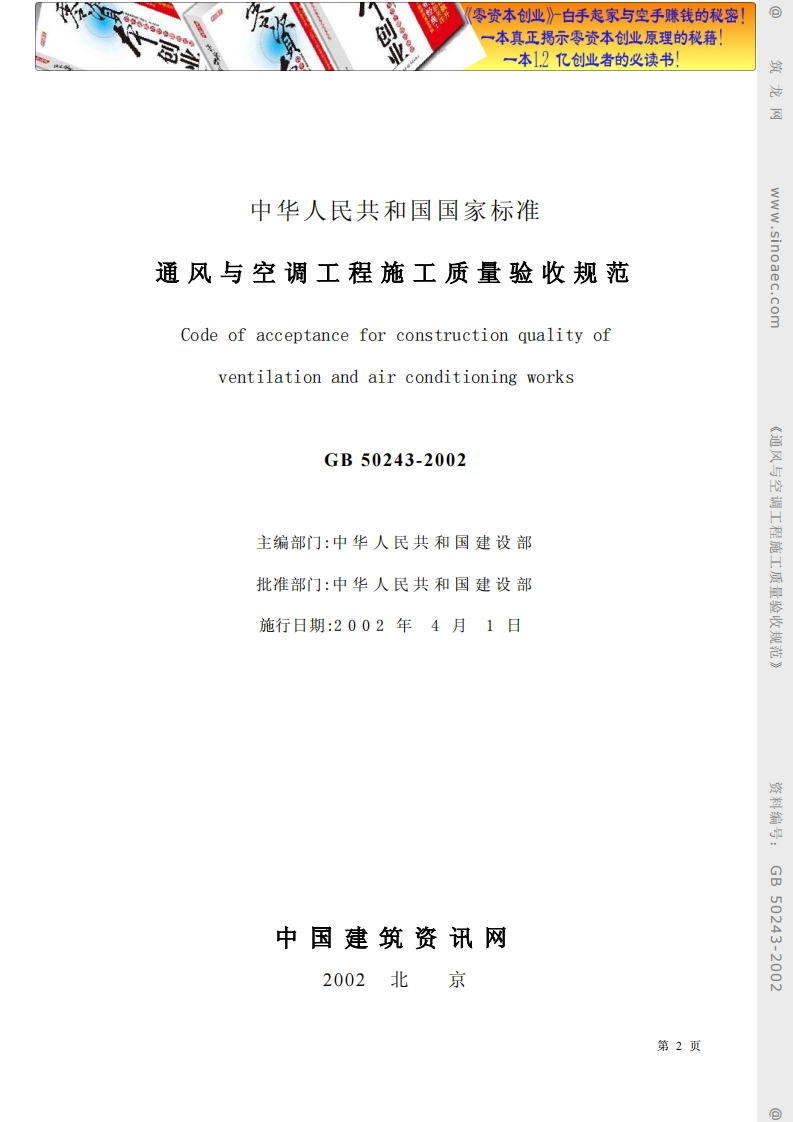 零资本创业》白手起家与空手赚钱的秘密!本真正揭示零资本创业原理的秘藉!一本2亿创业者的必读书!UDC中华人民共和国国家标准PGB50243-2002www.sinoaec.com通风与空调工程施工质量验收规范Code of acceptance for construction quality ofventilation and air conditioning works2002一03一15发布2002-04—01实施中华人民共和国国家质量监督检验检疫总局联合发布中华人民共和国建设部50243-2002第1页