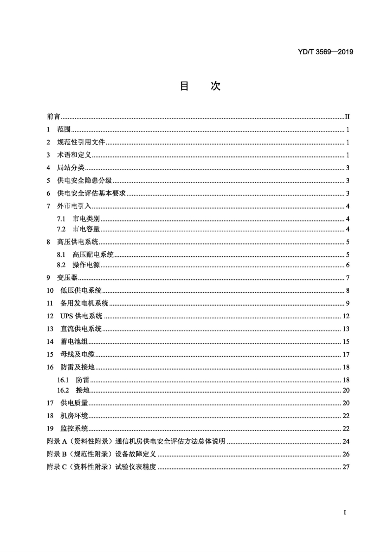通信机房供电安全评估方法348072@abc4个月前发布关注私信14.16MB30页033通信机房供电安全评估方法此内容为付费资源,请付费后查看¥13¥33黄金会员免费钻石会员免费立即购买您当前未登录!建议登陆后购买,可保存购买订单付费资源 第1页 / 共30页 第2页 / 共30页 试读已结束,还剩28页,您可下载完整版后进行离线阅读 THE END标准规范 文本预览 1CS33.040M41YD中华人民共和国通信行业标准YD/T3569-2019通信机房供电安全评估方法Evaluation method of safety for power supply in communication room2019-11-11发布2020-01-01实施中华人民共和国工业和信息化部发布 查看更多 收起部分 喜欢就支持一下吧收藏