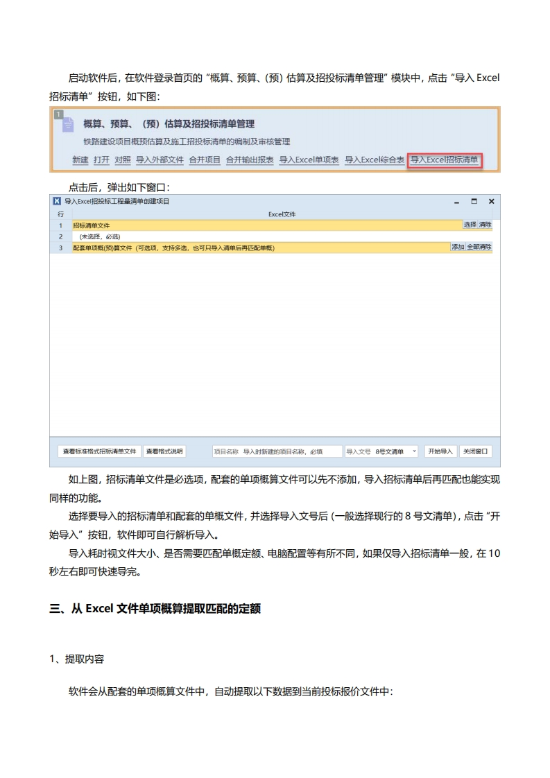 快速编制铁路工程投标报价文件说明一、功能快速指引1、快速导入招标清单软件配置有丰富的招标清单格式数据模型,可自行判断识别各种规范以及不规范的招标清单格式,少数项目存在编码错误或者混乱的情况,按软件提示的位置进行检查即可。软件的解析和导入过程是全自动化的,不需要您做任何的人工干预。2、自动匹配提取单项概算中的定额等数据在导入招标清单的同时,就可选择配套的单项概算文件,如果暂时没有获取单项概算,可先导入招标清单,再进行匹配提取。软件支持以下匹配提取功能:1)支持同时从任意多个单项概算文件匹配提取,软件可从各单项概算文件中自动区分识别提取;2)支持各种模糊匹配识别(比如序号差异、数量不同等),清单和单概数量不同时,支持自动按清单量比例换算定额工程数量,解决招标清单和单概版本差异问题;3)可同时提取导入单项概算文件中的清单指标和运杂费指标。4)支持自动定位所导入的单项概算文件位置,便于自动查看并快速比对数据源,支持全自动调价(默认按单概中的指标为基准调价目标,可修改),单概匹配度高且无其他调价特殊需求的话,半小时内能完成投标报价文件编制工作。5)只能获取到PDF版转换到EXcl版的单项概算时,软件提供规范化整理转换工具(PDF的格式一般都比较混乱,不是规范的单项概算表格式)。3、从资源库(或其他项目文件)提取定额无法获取与招标清单配套的单项概算时,软件可以采用从资源库或历史项目文件中提取匹配的方法,来自动化生成投标报价定额。这里的“历史项目文件"支持多种文件格式如tlj、rpec、reco、rejj.rejg等。总之,如果能获取配套单项概算,则优先从单项概算匹配定额,无法获取单项概算时,可以从以往现成的投标报价文件中匹配定额。二、导入招标工程量清单