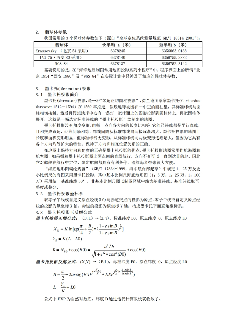 常用地图投影转换公式青岛海洋地质研究所戴勤奋(Email:qddginfenecgs.gov.cn)最近几乎天天都有Emai1跟我要这样、那样的坐标系转换或投影转换公式,或问我编的投影程序公式是哪来的,有没有专门介绍投影公式的书等等,让我越来越觉得有必要就此方面写点东西,一来我自己总结一下,二来对那些我没有回Emai1的同行也有个交代,因为那些公式实在太难敲了。我在“海洋地质制图常用地图投影系列小程序”(http:/www.gissky..net)中用的公式来自我原来的积累,同时参考了POSC(http:/www.posc.org,国际石油技术软件开放公司)的文献“CoordinateConversions and Transformation including Formulas”,该文献由EPSG(http:/www.epsg.org,欧洲石油勘探组)编写,比较全面地介绍了各种地图投影与坐标系的转换方法及计算公式,而且最新更新到了2004年,是我目前看到的最全面、最新的相关文档了,只不过是英文的,我正在打算将它们翻成中文,到时与大家共享。投影计算公式往往表达方式不止一种,有时很难分辨谁对谁错,我只把“墨卡托投影”、“高斯-克吕格投影”、“UTM投影”、“兰勃特等角投影”(1:100万地形图规范中称作正轴等角圆锥投影,GB/T14512-93)的正反转换公式列出,因为我基本能保证这些公式的正确性。“海洋地质制图常用地图投影系列小程序”(http:/www.gissky.net)己升级,原下载者请注意下载更新版本。1.约定本文中所列的转换公式都基于椭球体a-椭球体长半轴b一椭球体短半轴f-扁率(a-b)/ae第一偏心率e=√h-(b/a)2e'一第二偏心率e'=Va/b2-1(a2/b)N一卯酉圈曲率半径N=v1+e2*cos2 Ba(1-e2)R-子午圈曲率半径R=(1-e2*sin2B)2B--纬度,L-经度,单位弧度(RAD)Xw-一纵直角坐标,Y一横直角坐标,单位米()