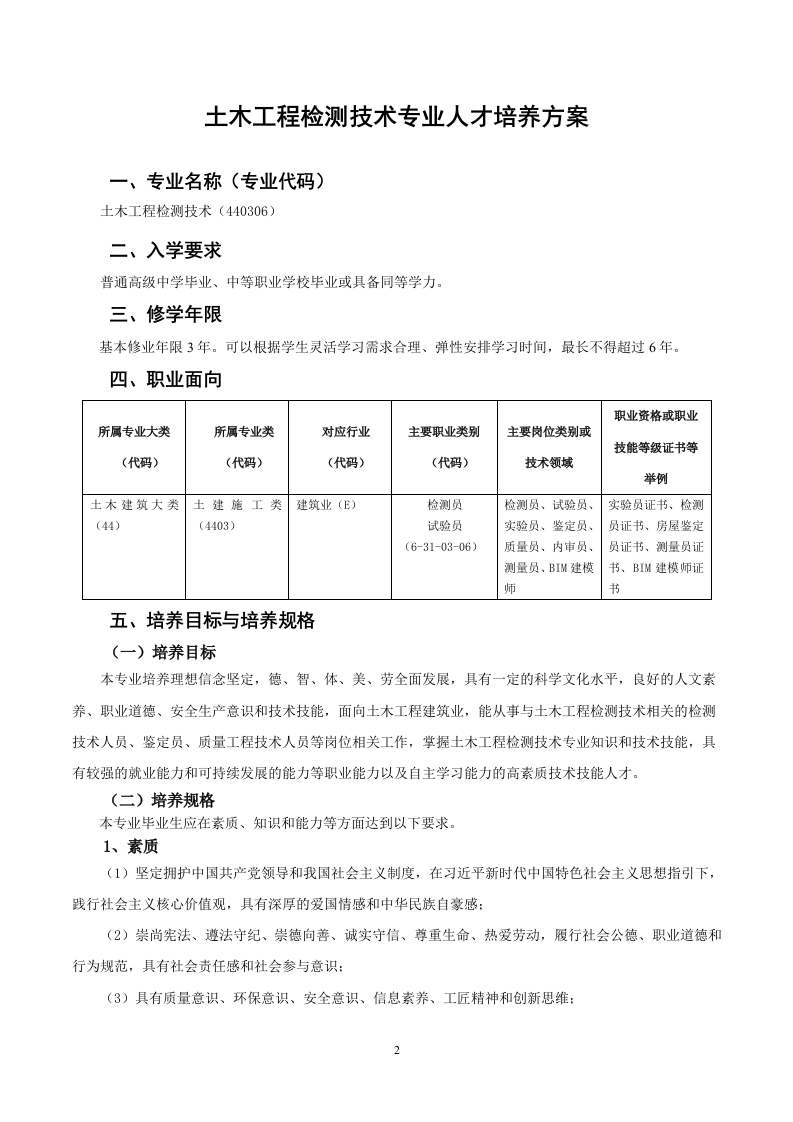 土木工程检测技术专业(普高三年制)人才培养方案348072@abc4个月前发布关注私信0.93MB28页046土木工程检测技术专业(普高三年制)人才培养方案此内容为付费资源,请付费后查看¥13¥33黄金会员免费钻石会员免费立即购买您当前未登录!建议登陆后购买,可保存购买订单付费资源 第1页 / 共28页 第2页 / 共28页 试读已结束,还剩26页,您可下载完整版后进行离线阅读 THE END标准规范 文本预览 度东避没藏紫技饮院10GUANGDONG CONSTRUCTION POLYTECHNIC土木工程检测技术专业人才培养方案专业名称:土木工程检测技术专业代码:440306适用年级:2024级修业年限:3年所属院系:土木工程学院编制部门:土木工程检测技术教研室广东建设职业技术学院制2024年4月 查看更多 收起部分 喜欢就支持一下吧收藏