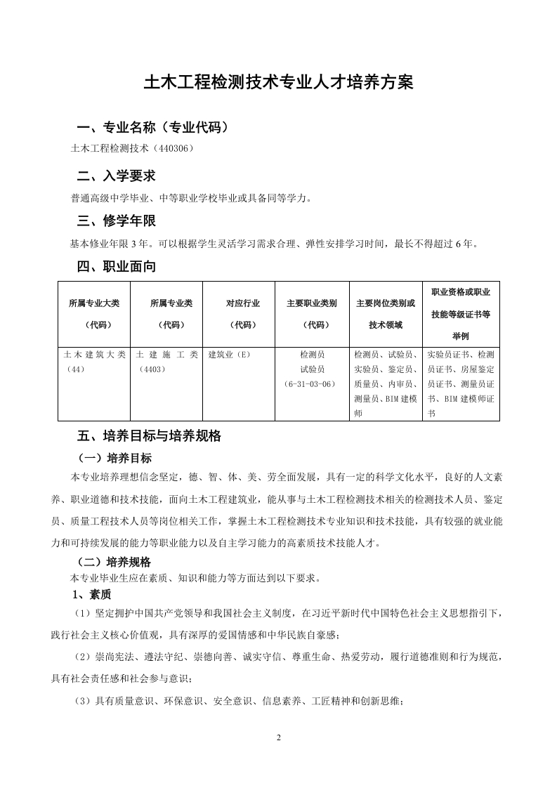 土木工程检测技术专业(普高三年制)人才培养方案_2348072@abc4个月前发布关注私信0.97MB29页043土木工程检测技术专业(普高三年制)人才培养方案_2此内容为付费资源,请付费后查看¥13¥33黄金会员免费钻石会员免费立即购买您当前未登录!建议登陆后购买,可保存购买订单付费资源 第1页 / 共29页 第2页 / 共29页 试读已结束,还剩27页,您可下载完整版后进行离线阅读 THE END标准规范 文本预览 廣东速没微紫技饮当院10GUANGDONG CONSTRUCTION POLYTECHNIC土木工程检测技术专业人才培养方案专业名称:土木工程检测技术专业代码:440306适用年级:2022级修业年限:3年所属院系:土木工程学院编制部门:土木工程检测技术教研室广东建设职业技术学院制2022年4月 查看更多 收起部分 喜欢就支持一下吧收藏