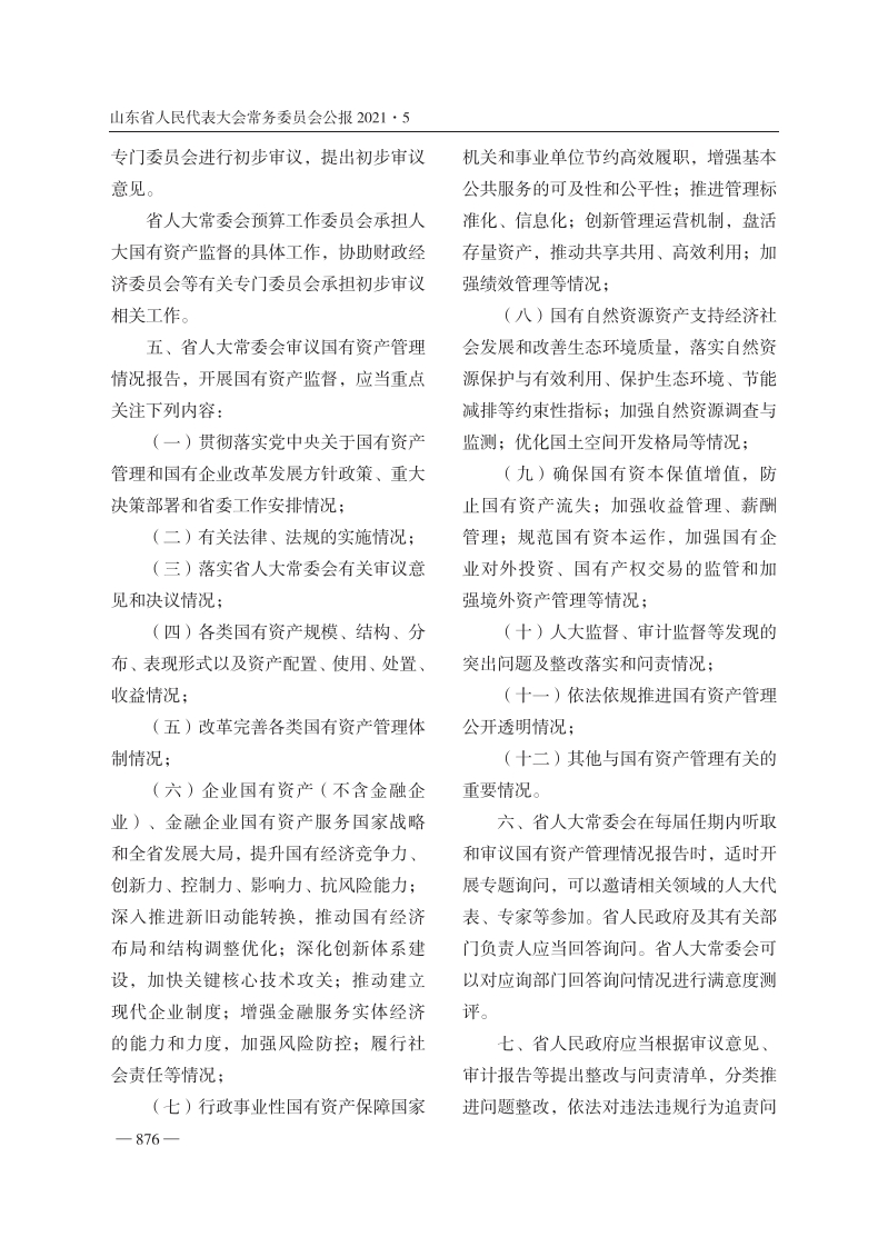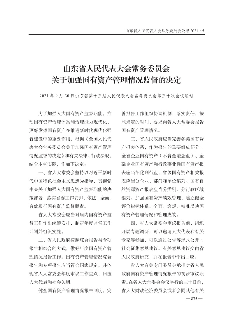 山东省人民代表大会常务委员会公报2021·5山东省人民代表大会常务委员会关于加强国有资产管理情况监督的决定2021年9月30日山东省第十三届人民代表大会常务委员会第三十次会议通过为了加强人大国有资产监督职能,推善报告工作组织协调机制,落实责任,按动国有资产治理体系和治理能力现代化,照规定的时间、要求向省人大常委会报告更好发挥国有资产在推进新时代现代化强国有资产管理情况。省建设中的重要作用,根据《全国人民代三、省人民政府应当完善各类国有资表大会常务委员会关于加强国有资产管理产报表体系,作为报告的重要组成部分。情况监督的决定》和有关法律、行政法规,全省企业国有资产(不含金融企业)、金结合本省实际,作如下决定:融企业国有资产和行政事业性国有资产报一、省人大常委会坚持以习近平新时表应当细化到行业,省级国有资产相关报代中国特色社会主义思想为指导,贯彻党表应当分企业、部门和单位编列。国有自中央关于加强人大国有资产监督职能的决然资源资产报表应当分类别、分行政区域策部署,落实省委工作安排,依法、全面、编列。加强国有资产绩效管理,建立健全有效履行国有资产监督职责。评价指标体系,全面、客观、精准反映国省人大常委会应当对届内国有资产监有资产管理情况和管理成效。督工作作出统筹安排,制定年度监督工作四、省人大常委会审议报告前,组织计划并组织实施开展专题调研,可以邀请人大代表和有关二、省人民政府按照综合报告与专项专家等参加,可以通过公告等形式公开向报告相结合的方式,做好年度国有资产管社会征集意见建议。有关意见建议交由省理情况报告工作。国有资产管理情况综合人民政府研究,并在报告中作出回应。报告和专项报告应当符合国家规定,并体省人大有关专门委员会承担对省人民现省人大常委会年度审议工作重点,回应政府国有资产管理情况报告的初步审议职人大代表和社会关切。责。在省人大常委会会议举行的三十日前,健全国有资产管理情况报告制度,完省人大财政经济委员会或者会同其他有关—875