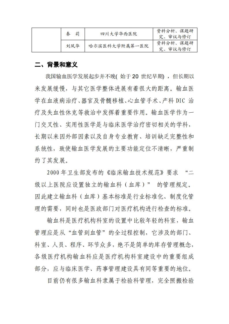 中国输血协会团体标准医疗机构输血科和血库基本要求编制说明一、任务来源在国家卫生和计划生育委员会法制司委托下,2014年6月,北京医院承担了《医疗机构输血科(血库)基本要求》的编制任务。该项目编号为:20141603.2018年8月受中国输血协会临床输血管理学专业委员会委托承担《医疗机构输血科和血库基本要求》的编制任务,项目编号为P2018-014。主要参与人员及承担的工作如下:编制人员姓名所在单位承担工作项目标准总体规划、框架负责人宫济武北京医院设计,制定编写要求及最终审定工作柴庆波北京大学第一医院资料分析、课题研究、审议与修订白连军中国医学科学院北京协和医院资料分析、课题研究、审议与修订赵国华中国医学科学院北京肿瘤医院资料分析、课题研究、审议与修订李淑萍首都医科大学附属同仁医院资料分析、课题研究、审议与修订主要参加曹旭梅北京华信医院资料分析、课题研人员究、审议与修订曹晓明航天中心医院资料分析、课题研究、审议与修订中国医学科学院阜外心血管病纪宏文资料分析、课题研医院究、审议与修订曹永彤资料分析、课题研中日友好医院究、审议与修订上海交通大学附属第六人民医李志强资料分析、课题研院究、审议与修订