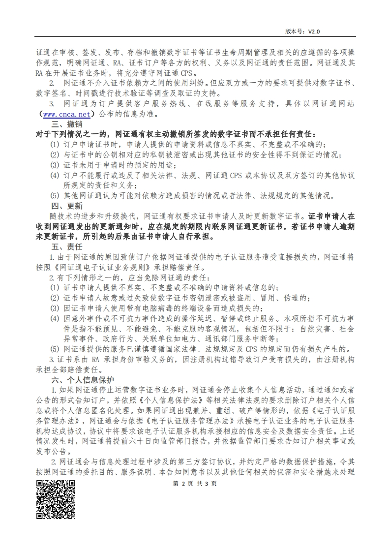 版本号:V2.0网证通电子认证服务协议(本协议包含网证通的免责条款,请认真阅读,尤其是粗体字内容)尊散的订户:广东省电子商务认证有限公司(简称“网证通”、NETCA)是首批经批准设立的电子认证服务机构,依照《中华人民共和国电子签名法》为订户提供数字证书相关的电子认证服务。本协议中的订户指数字证书持有人以及申请使用数字证书的实体。订户在申请、使用网证通签发的数字证书之前,应先阅读并同意《网证通电子认证服务协议》(以下称本协议)。本协议构成订户与网证通之间的权利义务约定,若不同意本协议全部或部分条款,请勿申请(包括续期、更新)、下载或使用网证通数字证书。订户一旦进行网证通数字证书的申请(包括续期、更新)、下载或使用,即表明同意接受并愿意遵守本协议的所有条款。一、证书订户的权利与责任1.订户必须按照网证通或网证通的注册机构(以下筒称“RA”)的有关规程申请数字证书,同时必须对所提供资料的真实性、完整性、合法性负责:若订户仅需上传电子版申请资料时,订户应保证电子版申请资料与原件内容一致:若信息、资料发生改变时订户应当及时向网证通或原RA申请变更。如因订户故意或过失提供的资料不真实或资料信息改变后未及时向网证通或原RA申请变更,造成的任何后果由订户自行承担。2.订户在申请办理数字证书时提交的相应信息、资料,经授权经办人在本协议签字或盖章或点击确认,即视为明确理解并同意网证通将上述提交的信息、资料用于开展电子签名、数字证书服务等相关业务,同时向相关方提供证书查询服务。若基于项目要求,订户仅上传电子版申请资料的,网证通以收到的电子版申请资料内容为准制作数字证书。3。证书订户应当妥善保管网证通所签发的数字证书和私钥及保护密码。证书密码不得泄厚或交付他人。如因故意、过失导致数字证书私钥或保护密码被他人盗用、冒用、伪造或者,改时,订户应承担由此产生的一切风险及对应法律责任。4.如遇证书遗失或被窃,证书订户应立即到网证通或原RA办理挂失/撤销,撤销手续遵循网证通的规定。网证通在收到符合要求的书面撒销申请后24小时内撒销证书订户数字证书,在数字证书撒销之前所有使用数字证书造成的责任由证书订户承担。5.订户应当在对应的项目/系统/平台范围内使用数字证书,证书订户独立享有数字证书的使用权,但不得超出使用范围或利用证书从事违反国家法律法规或危害国家安全的行为。因使用数字证书产生的责任由证书订户自行承担。6.在订户申请和使用证书过程中,禁止利用证书发布、复制、传播违法信息,遵守法律法规、社会主义制度、国家利益、公民合法权益、公共秩序、社会道德风尚。7.证书应由订户本人或其授权代理人、机构授权经办人亲自领取、保管。订户在获得数字证书后应及时验证此证书所匹配的信息,如3个工作日内未提出异议则视为接受证书:若选择邮寄领取证书方式,则邮寄件接收后(以邮件签收时间为准),即表示证书已正常接收。8。订户应按期缴纳数字证书服务费用,费用标准见网站公告或咨询具体RA。二、网证通的权利与义务1.网证通依法制定《网证通电子认证业务规则》《网证通电子政务电子认证业务规则》(以下统称“网证通CPS”),并公布于网证通网站(www.cnca.net)。网证通CPS规定了网第1页共3页