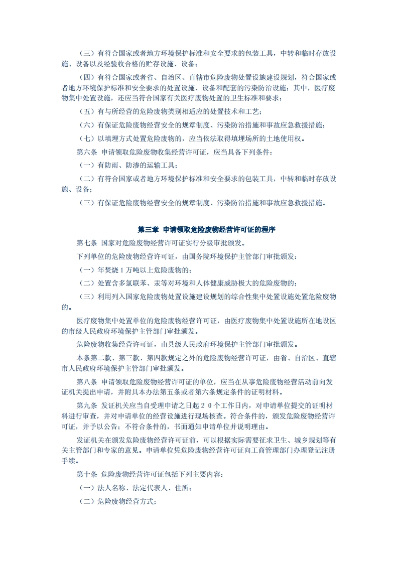 危险废物经营许可证管理办法颁布机关:国务院颁布时间:2004-05-30实施时间:2004-07-01修订时间:发文文号:时效性:有效中华人民共和国国务院令第408号《危险废物经营许可证管理办法》已经2004年5月19日国务院第50次常务会议通过,现予公布,自2004年7月1日起施行。总理温家宝二OO四年五月三十日第一章总则第一条为了加强对危险废物收集、贮存和处置经营活动的监督管理,防治危险废物污染环境,根据《中华人民共和国固体废物污染环境防治法》,制定本办法。第二条在中华人民共和国境内从事危险废物收集、贮存、处置经营活动的单位,应当依照本办法的规定,领取危险废物经营许可证。第三条危险废物经营许可证按照经营方式,分为危险废物收集、贮存、处置综合经营许可证和危险废物收集经营许可证。领取危险废物综合经营许可证的单位,可以从事各类别危险废物的收集、贮存、处置经营活动:领取危险废物收集经营许可证的单位,只能从事机动车维修活动中产生的废矿物油和居民日常生活中产生的废镉镍电池的危险废物收集经营活动。第四条县级以上人民政府环境保护主管部门依照本办法的规定,负责危险废物经营许可证的审批颁发与监督管理工作。第二章申请领取危险废物经营许可证的条件第五条申请领取危险废物收集、贮存、处置综合经营许可证,应当具备下列条件:(一)有3名以上环境工程专业或者相关专业中级以上职称,并有3年以上固体废物污染治理经历的技术人员:(二)有符合国务院交通主管部门有关危险货物运输安全要求的运输工具: