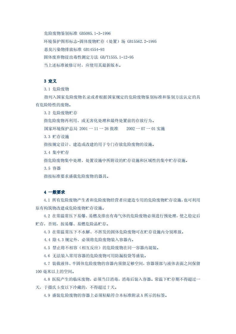 危险废物贮存污染控制标准中华人民共和国国家标准GB18597-2001Standard for Pollution Control on Hazardous Waste Stora2001-12-28发布2002-07-01实施国家环境保护总局发布国家质量监督检验检疫总局前言为贯彻《中华人民共和国固体废物污染环境防治法》,防止危险废物贮存过程造成的环境污染,加强对危险废物贮存的监督管理,制定本标准。本标准规定了对危险废物贮存的一般要求,对危险废物包装、贮存设施的选址、设计、运行、安全防护、监测和关闭等要求。本标准为首次发布。本标准中附录A是标准的附录,附录B是提示的附录。本标准由国家环保总局科技标准司提出。本标准由沈阳环境科学研究所负责起草。本标准由国家环境保护总局负责解释。1主题内容与适用范图1.1主题内容本标准规定了对危险废物贮存的一般要求,对危险废物的包装、贮存设施的选址、设计、运行、安全防护、监测和关闭等要求。1.2适用范围本标准适用于所有危险废物(尾矿除外)贮存的污染控制及监督管理,适用于危险废物的产生者、经营者和管理者。2引用标准下列标准所含的条文,通过在本标准中引用而构成本标准的条文,与本标准同效。大气污染物综合排放标准GB16297-1996污水综合排放标准GB8978-1996