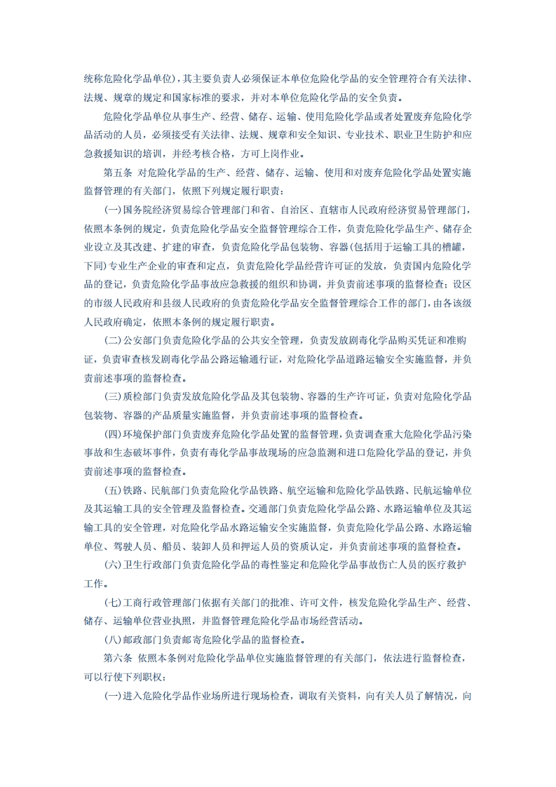 危险化学品安全管理条例中华人民共和国国务院令第344号《危险化学品安全管理条例》已经2002年1月9日国务院第52次常务会议通过,现予公布,自2002年3月15日起施行。总理朱镕基2002年1月26日目录第一章总则第二章危险化学品的生产、储存和使用第三章危险化学品的经营第四章危险化学品的运输第五章危险化学品的登记与事故应急救援第六章法律责任第七章附则第一章总则第一条为了加强对危险化学品的安全管理,保障人民生命、财产安全,保护环境,制定本条例。第二条在中华人民共和国境内生产、经营、储存、运输、使用危险化学品和处置废弃危险化学品,必须遵守本条例和国家有关安全生产的法律、其他行政法规的规定。第三条本条例所称危险化学品,包括爆炸品、压缩气体和液化气体、易燃液体、易燃固体、自燃物品和遇湿易燃物品、氧化剂和有机过氧化物、有毒品和腐蚀品等。危险化学品列入以国家标准公布的《危险货物品名表》(GB12268):剧毒化学品目录和未列入《危险货物品名表》的其他危险化学品,由国务院经济贸易综合管理部门会同国务院公安、环境保护、卫生、质检、交通部门确定并公布。第四条生产、经营、储存、运输、使用危险化学品和处置废弃危险化学品的单位(以下