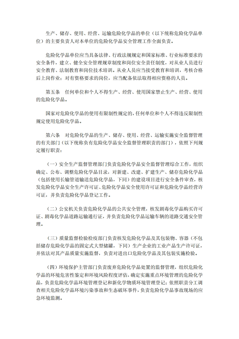 中华人民共和国国务院令第591号《危险化学品安全管理条例》已经2011年2月16日国务院第144次常务会议修订通过,现将修订后的《危险化学品安全管理条例》公布,自2011年12月1日起施行。总理温家宝二O一一年三月二日危险化学品安全管理条例(2002年1月26日中华人民共和国国务院令第344号公布2011年2月16日国务院第144次常务会议修订通过)第一章总则第一条为了加强危险化学品的安全管理,预防和减少危险化学品事故,保障人民群众生命财产安全,保护环境,制定本条例。第二条危险化学品生产、储存、使用、经营和运输的安全管理,适用本条例。废弃危险化学品的处置,依照有关环境保护的法律、行政法规和国家有关规定执行。第三条本条例所称危险化学品,是指具有毒害、腐蚀、爆炸、燃烧、助燃等性质,对人体、设施、环境具有危害的剧毒化学品和其他化学品。危险化学品目录,由国务院安全生产监督管理部门会同国务院工业和信息化、公安、环境保护、卫生、质量监督检验检疫、交通运输、铁路、民用航空、农业主管部门,根据化学品危险特性的鉴别和分类标准确定、公布,并适时调整。第四条危险化学品安全管理,应当坚持安全第一、预防为主、综合治理的方针,强化和落实企业的主体责任。