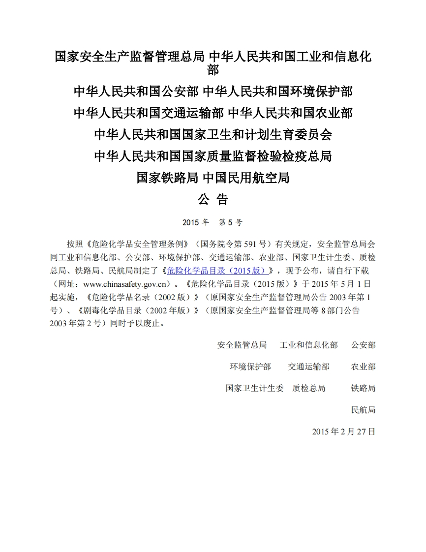 国家安全生产监督管理总局中华人民共和国工业和信息化部中华人民共和国公安部中华人民共和国环境保护部中华人民共和国交通运输部中华人民共和国农业部中华人民共和国国家卫生和计划生育委员会中华人民共和国国家质量监督检验检疫总局国家铁路局中国民用航空局公告2015年第5号按照《危险化学品安全管理条例》(国务院令第591号)有关规定,安全监管总局会同工业和信息化部、公安部、环境保护部、交通运输部、农业部、国家卫生计生委、质检总局、铁路局、民航局制定了《危险化学品目录(2015版)》,现予公布,请自行下载(网址:www.chinasafety..gov.cn)。《危险化学品目录(2015版)》于2015年5月1日起实施,《危险化学品名录(2002版)》(原国家安全生产监督管理局公告2003年第1号)、《剧毒化学品目录(2002年版)》(原国家安全生产监督管理局等8部门公告2003年第2号)同时予以废止。安全监管总局工业和信息化部公安部环境保护部交通运输部农业部国家卫生计生委质检总局铁路局民航局2015年2月27日