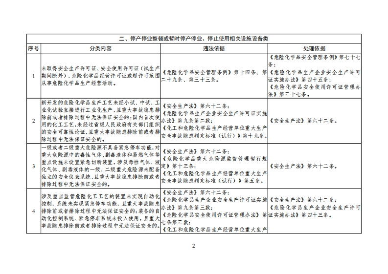 附件危险化学品企业安全分类整治目录(2020年)暂扣或吊销安全生产许可证类序号分类内容违法依据处理依据新建、改建、扩建生产危险化学品的建设项目未经具备国家规定资质的单位设计、制造和施工建设:涉及危险化工工艺、重点监管危险化学品的危险化《危险化学品生产企业安全生产许可证实施《危险化学品生产企业安全生产许可学品生产装置,未经具有综合甲级资质或者化工石协法》第九条第一款,证实施办法》第四十三条,化专业甲级设计资质的化工石化设计单位设计,《安全生产法》第三十五条:《危险化学品生产企业安全生产许可证实施《安全生产许可证条例》第十四条第二使用国家明令淘汰落后安全技术工艺,设备目录列办法》第九条第二款:概:出的工艺、设备,《危险化学品生产企业安全生产许可《化工和危险化学品生产经营单位重大生产证实施办法》第四十三条,安全事故隐患想判定标准(试行)》第十一条。《安全生产法》第十七条:《安全生产许可证条例》第十四条第二涉及“两重点一重大”的生产装置、储存设施外部安《危险化学品生产企业安全生产许可证实施3全防护距离不符合国家标准要求,且无法整改的,协法》第八条第二款、第九条第五款:《危险化学品生产企业安全生产许可《化工和危险化学品生产经营单位重大生产安全事故隐患判定标准(试行)》第三条,证实施办法》第四十三条,《危险化学品生产企业安全生产许可证实施《安全生产许可证条例》第十四条第二涉及重点监管危险化工工艺的装置未装设自动化协法》第九条第三款:控制系统。《化工和危险化学品生产经营单位重大生产《危险化学品生产企业安全生产许可安全事故隐患判定标准(试行)》第四条,证实施办法》第四十三条,