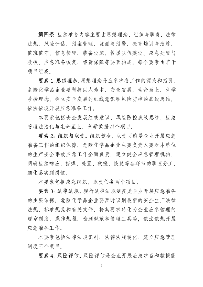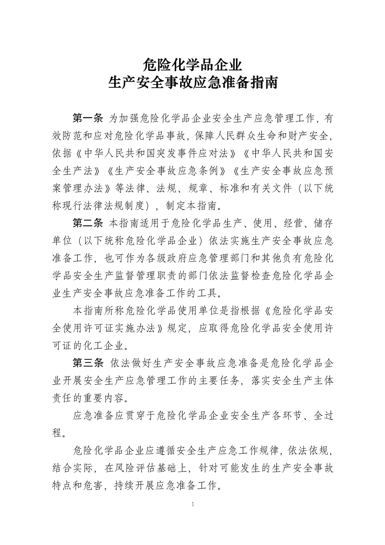 危险化学品企业生产安全事故应急准备指南第一条为加强危险化学品企业安全生产应急管理工作,有效防范和应对危险化学品事故,保障人民群众生命和财产安全,依据《中华人民共和国突发事件应对法》《中华人民共和国安全生产法》《生产安全事故应急条例》《生产安全事故应急预案管理办法》等法律、法规、规章、标准和有关文件(以下统称现行法律法规制度),制定本指南。第二条本指南适用于危险化学品生产、使用、经营、储存单位(以下统称危险化学品企业)依法实施生产安全事故应急准备工作,也可作为各级政府应急管理部门和其他负有危险化学品安全生产监督管理职责的部门依法监督检查危险化学品企业生产安全事故应急准备工作的工具。本指南所称危险化学品使用单位是指根据《危险化学品安全使用许可证实施办法》规定,应取得危险化学品安全使用许可证的化工企业。第三条依法做好生产安全事故应急准备是危险化学品企业开展安全生产应急管理工作的主要任务,落实安全生产主体责任的重要内容。应急准备应贯穿于危险化学品企业安全生产各环节、全过程。危险化学品企业应遵循安全生产应急工作规律,依法依规,结合实际,在风险评估基础上,针对可能发生的生产安全事故特点和危害,持续开展应急准备工作。1