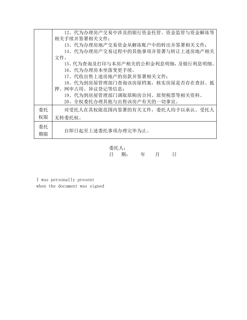 出售房产委托书姓名XXX性别女国籍中国人出生日期XXX护照号码XX姓名XXX性别男国籍中国受托人出生日期XX身份证号XX住址:北京市XXX委托人XXX(身份证编号:XXX)名下拥有坐落于XXXXXX(房屋所有权证编号:X京房权XXXXX)的房产,现拟出售,因委托人工作繁忙,特委托XXX作为我们的合法代理人,并全权代表我们办理如下事项:1、代为办理银行的提前还款手续,领取还款证明:2、领取银行出具的解除抵押证明材料,办理解除抵押登记及与之有关的一切手续,领取解除抵押登记后的房产证:3、到房管局查阅与该房产相关的一切档案资料:代办网签手续及注销网签手续:4、代办房屋的立契过户,权属登记,及房本物业地址变更,及所有权变更登记等相关一切手续:5、代办出售上述房地产的产权过户,税务登记等一切手续:委托6、代为缴纳转让上述房地产过程中的有关税费:7、如买方需要办理贷款,则有权协助买方办理贷款手续,包括但不限于事项前往xxx住房公积金管理中心xxxx区管理部办理贷款手续,代委托人签订《首付款收据》、《房价款收据》、《存量房屋买卖合同》、《尚未办理商业贷款的声明》、《证明书》、《确认书》、《划款协议》、《房屋未出租证明》、《存量房交易结算资金划转协议》、《存量房交易结算资金自行划转声明》。受托人代我签订的上述文件我均予以承认,我承担由此产生的一切法律后果:8、如买方需要向银行申请商业贷款,则有权协助买方办理银行商业贷款手续并签署相关文件:9、转让上述房产过程中,有权代为接受房屋管理部门的询问并签署相关文件:10、代为办理物业交割手续并签署有关文件:11、代为办理网络、有线电视、水、电、燃气等的过户手续并签署有关文件:
