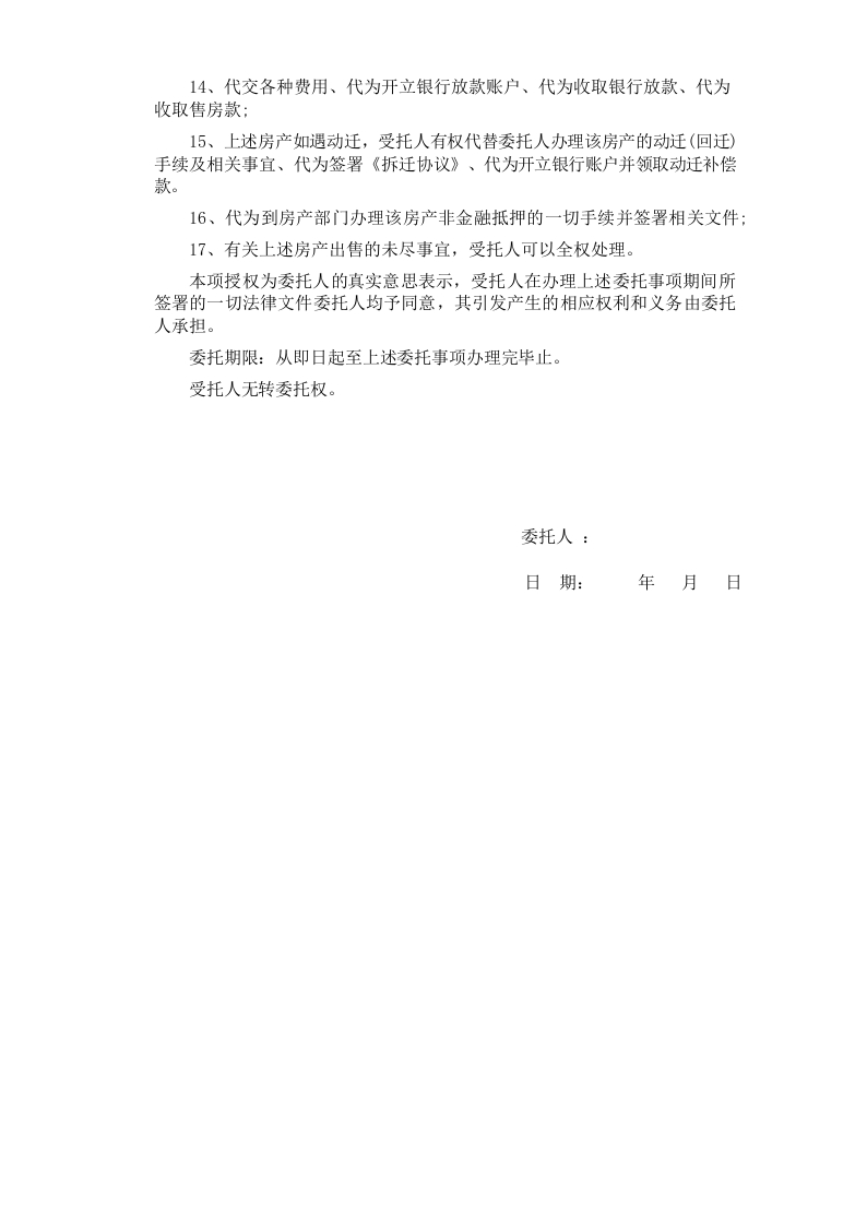 授权委托书委托人:xxx,女,1965年xxxx日出生,护照编号:Exxx,住址:广东省广州市海xXx路61号xx房,公民身份号码:XxX受托人:Xxxx,男(性别),1961年xxx日出生,住址:广东省广州市海珠区革xxx房,公民身份号码:(I旧)护照XXXXX;(新)护照:Xx委托人XXx和xxx系夫妻关系,我们是坐落于广东省广州市海珠区革新路天鹅街3号2804房房产的所有权人。该房产建筑面积:68.35平方米,房屋所有权证编号:穗字xxx号、穗字xx号,登记字号:12登记xxx。现因委托人有特殊原因无法亲自到场,特委托xxx全权代我办理与出售该房产有关的所有事宜,具体包括如下事项:1、受托人以委托人的名义到贷款银行办理该房产银行(或住房公积金贷款)提前还款的一切手续,领取注销抵押凭证并到房产抵押部门(或担保部门)办理该房产的抵押注销手续及签署相关法律文件:2、代为签署《房屋抵押合同》,代为到房产抵押部门办理该房产的抵押手续、领取他项权利证、领取抵押后的《房屋所有权证》及签署相关法律文件3、到房产抵押部门办理该房产的抵押注销手续及签署相关法律文件:4、领取上述注销抵押后的《房屋所有权证》:5、签署《房屋买卖合同》,代为办理该房产的产权交易、更名、过户、查档等与出售上述房产有关的一切事宜:6、受托人有权代替委托人回答上述房产产权(或抵押)登记询问笔录并代替原房主签署房产承诺书:7、如上述房产地址、面积与实际不符,受托人有权代为办理更改并领取地址、面积更正后的《房屋所有权证》、《契证》:8、代为办理该房产《土地使用证》的更名手续并签署相关文件:9、代为到当地税务部门交纳该房产交易时所产生的各种税费并在契税、营业税、个税、印花税等税费单上签字确认,同时办理、领取该房产的《契证》:10、代为办理(或放弃)该房产二手房资金监管的一切手续并签署相关法律文件:11、代为办理该房产《房屋所有权证》、《契证》、《土地使用证》的挂失、补办手续:12、代为办理该房产室内的水、电、煤气、有线(数字)电视、宽带网、电话、物业、采暖等配套设施更名手续:13、代为协助买房人办理该房产的银行交易贷款(或住房公积金贷款)手续,并协助买房人到房产抵押部门(或担保部门)办理该房产的抵押(担保)手续、领取他项权利证及签署相关法律文件: