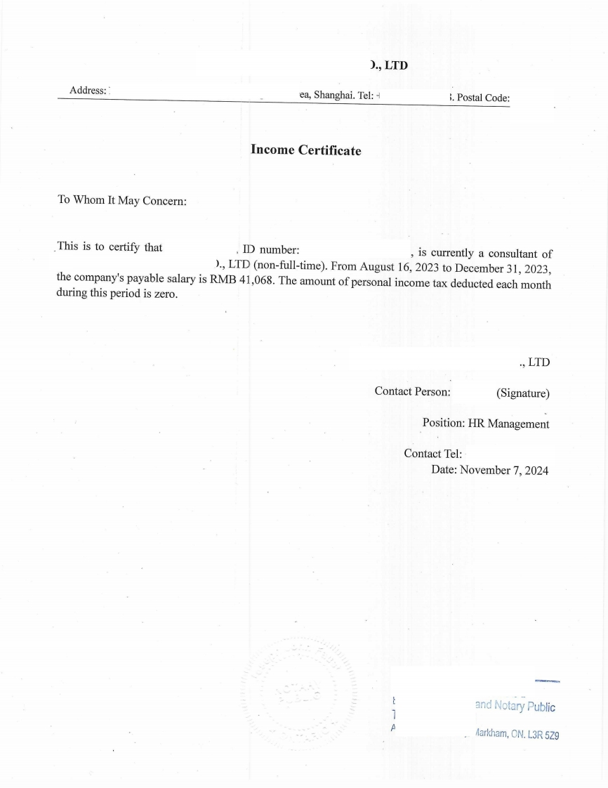 AFFIDAVIToath and say:translator in the City of Toronto,Province of Ontario,make1.I am fluent in both Chinese and English.2.I have translated the annexed document and carefully compared thetranslation from Chinese into English with regard to the followingdocument:Income Certificate3.The said translation is,to the best of my knowledge and ability,thecomplete and correct translation of said document.SWORN before me at the City of TorontoIn the Regional Municipality of MetropolitanTorontoThis day of0A Notary Public in and for theProvince of Ontario四入NDOAcitor and Notary PublloTel:Add:Markham,CN.L35 5Z9