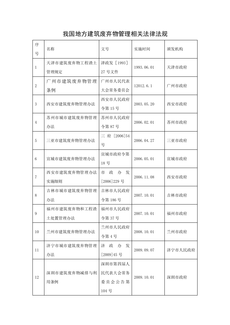 我国国家建筑废弃物管理相关法律法规序类别名称文号实施时间颁发机构奶环境保护法主席令第22号1989.12.26国务院固体废弃物污染环境防治法主席令第31号2005.04.01国务院3城市固体垃圾处理法1995.11国务院4法律清洁生产促进法主席令第72号2003.01.01国务院可再生能源法主席令第33号2010.04.01国务院6节约能源法主席令第17号2008.04.01国务院主席令第47循环经济促进法奶2009.01.01国务院法规城市市容和环境卫生管理条例国务院令第1992.101号08.01国务院9城市建筑废弃物管理规定建设部令第139号2005.06.01建设部部门规章10关于建筑废弃物资源化再利用中央编办部门职责分工的通知2010.10.25国务院全国城市生活垃圾无害化处理发改投资11设施建设“十一五”规划[2007]1760发改委规范性文号件12地震灾区建筑废弃物处理技术建科[2008]992008.05.30导则建设部号