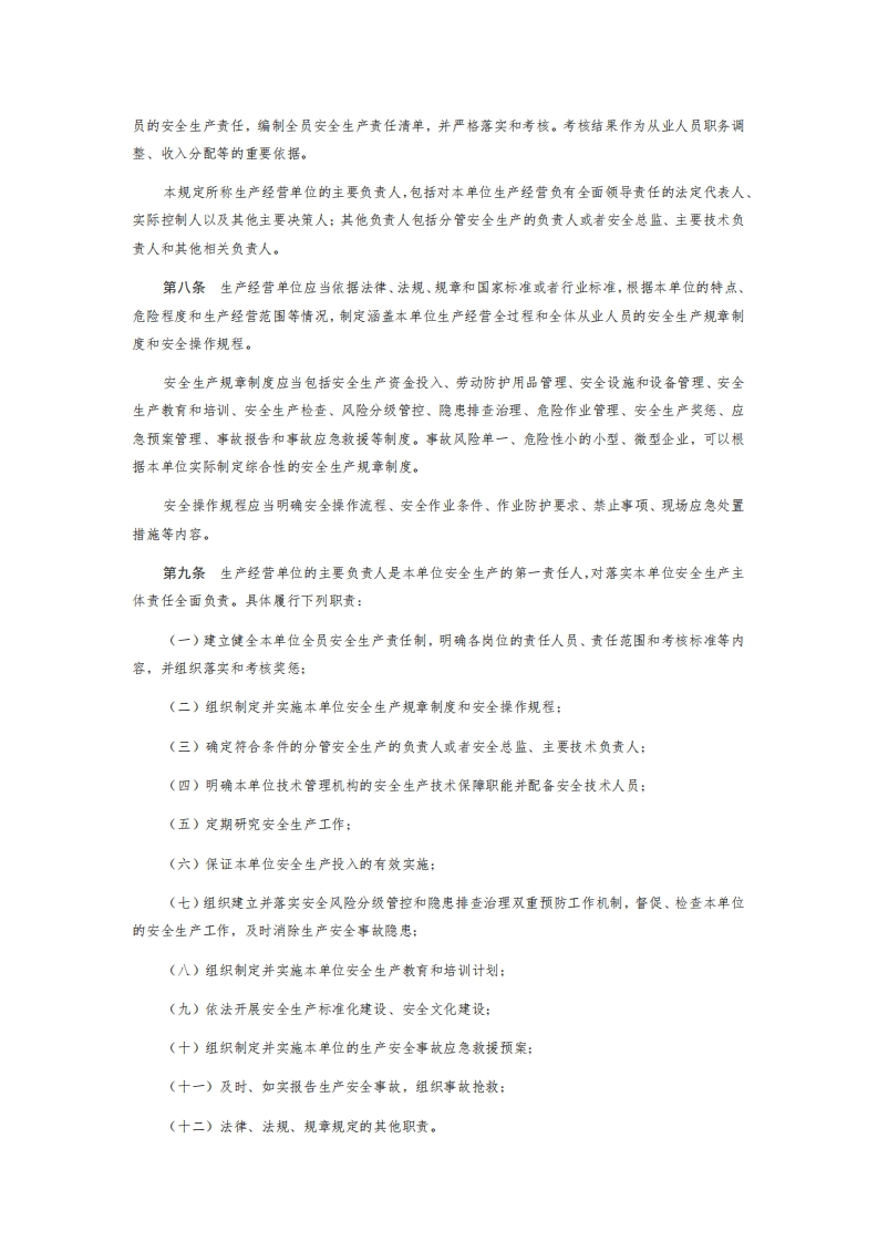来源:山东省人民政府网站【字体:大中小】打印山东省生产经营单位安全生产主体责任规定(2013年2月2日山东省人民政府令第260号公布根据2016年6月7日山东省人民政府令第303号《山东省人民政府关于修改(山东省生产经营单位安全生产主体责任规定》的决定》第一次修正根据2018年1月24日山东省人民政府令第311号《山东省人民政府关于修改(山东省节约用水办法》等33件省政府规章的决定》第二次修正根据2024年1月4日山东省人民政府令第357号《山东省人民政府关于修改和废止部分省政府规章的决定》第三次修正)第一条为了落实生产经营单位安全生产主体责任,预防和减少生产安全事故,保障人民群众生命健康和财产安全,促进经济社会持续健康发展,根据《中华人民共和国安全生产法》《山东省安全生产条例》等法律、法规,结合本省实际,制定本规定。第二条在本省行政区域内从事生产经营活动的单位履行安全生产主体责任,适用本规定。法律、法规、规章另有规定的,从其规定。第三条本规定所称生产经营单位,是指从事生产经营活动的企业、事业单位、个体经济组织以及其他组织。第四条生产经营单位是安全生产的责任主体,对本单位的安全生产承担主体责任。主体责任包括组织机构保障责任、规章制度和操作规程保障责任、安全生产投入责任、教育培训责任、安全风险分级管控和隐患排查治理责任、事故报告和应急救援责任以及法律、法规、规章规定的其他责任。第五条县级以上人民政府应急管理部门依法对生产经营单位履行安全生产主体责任实施综合监督管理:应急管理部门和其他负有安全生产监督管理职责的部门具体负责职责范围内生产经营单位履行安全生产主体责任的监督管理。第六条生产经营单位应当具备有关法律、法规、规章和国家标准或者行业标准规定的安全生产条件。对涉及安全生产的事项依法需要审查批准(包括批准、核准、许可、注册、认证、须发证照等)或者验收的,必须依法取得批准或者验收合格。第七条生产经营单位应当建立健全全员安全生产责任制,明确生产经营单位主要负责人、其他负责人、职能部门负责人、生产车间(区队)负责人、生产班组负责人、一般从业人员等全体从业人