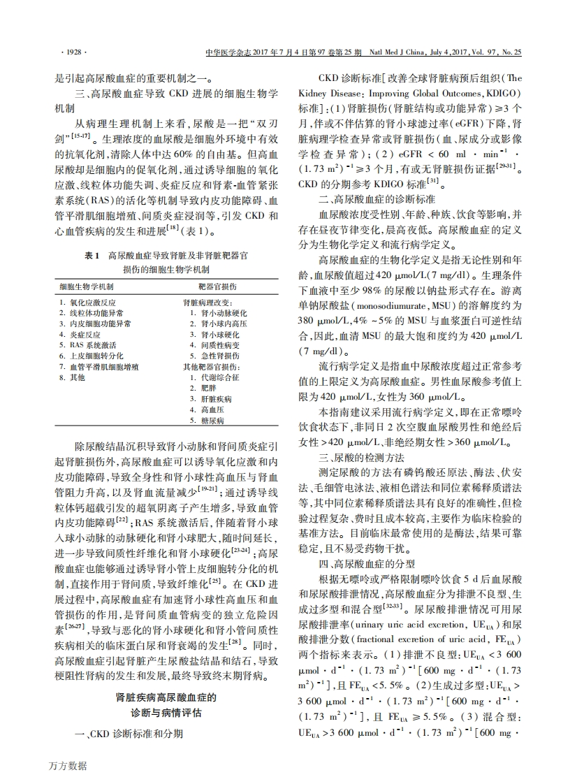 中华医学杂志2017年7月4日第97卷第25期Natl Med J China,Juy4,2017Vol.97,No.25·1927··标准与规范·中国肾脏疾病高尿酸血症诊治的实践指南(2017版)中国医师协会肾脏内科医师分会随着我国人民生活水平提高和生活方式改变,别增加4倍和9倍。随着肾小球滤过率的下降,高尿酸血症的患病率呈逐年上升趋势,已经成为我CKD患者高尿酸血症的患病率逐渐增加,波动在国重要的公共卫生问题。肾脏疾病是高尿酸血症的40%-70%p11。伴有高尿酸血症的CK①3-5期重要病因,而高尿酸血症也是慢性肾脏病(chronic患者出现肾脏病快速进展及达到肾脏替代治疗的风kidney disease,CKD)最常见的并发症之一。高尿酸险均较高)。CKD3~4期患者血尿酸水平每升高血症可加重肾脏病的进展和心脑血管并发症的发60μmo/L(1mg/d),心血管死亡风险增加16%,而生,是导致CKD、心脑血管疾病和代谢性疾病发生全因死亡风险增加17%【o。与发展的独立危险因素。目前我国尚缺乏针对肾脏疾病高尿酸血症诊治的临床实践指南。为此,我们肾脏疾病高尿酸血症的发病机制围绕肾脏疾病高尿酸血症的流行病学、发病机制、诊一、肾脏在血尿酸代谢中的重要作用断与病情评估、治疗等内容,制定《中国肾脏疾病高人体内嘌呤来源有两种:内源性嘌呤来源于自尿酸血症诊治的实践指南(2017版)》,以指导临床身合成或核酸降解(约600mgd),外源性嘌呤来自更规范地治疗肾脏疾病患者的高尿酸血症。摄入嘌呤饮食(约100mgd),分别约占每天体内尿肾脏疾病高尿酸血症的流行病学酸产生量的80%和20%。在正常状态下,体内尿酸池为1200mg,每天生成尿酸约700mg,其中2/3经随着经济的发展,生活方式和饮食结构发生改肾脏排泄,1/3从肠道排泄,另有极少量由汗腺排变,高尿酸血症(hyperuricemia)的患病率持续升高,泄。高尿酸血症的病因包括尿酸排泄减少、尿酸生中国成人高尿酸血症的患病率为8.4%~成增加和两者兼而有之三大类。已知肾脏尿酸13.3%1,中老年男性和绝经后女性为高发人群,的代谢过程包括滤过(肾小球100%滤过)-重吸收年轻化趋势加剧。高尿酸血症不仅是CK①新发的(98%在近端肾小管S1段重吸收)-分泌(50%在S2独立危险因素[),也是促进其进展的独立危险因段分泌)-分泌后重吸收(40%~44%在3段分泌后素s)。血尿酸每升高60mo/L(1mgd),肾脏重吸收)四个步骤,最后6%~10%肾小球滤过的尿病风险即增加7%~11%[6,肾功能恶化的风险增酸排出体外【。疾病、药物和遗传等因素均可导致加14%[)。与血尿酸正常人群相比,血尿酸水平在肾脏尿酸排泄功能下降,导致高尿酸血症发生。420-534μmol/L(7.0-8.9mg/dl)的人群新发肾二、肾脏疾病导致高尿酸血症发病机制脏疾病的危险增加2倍,而血尿酸≥540μmol/L肾小球和肾小管功能正常是保证尿酸排泄的重(9mg/d)的人群新发肾脏疾病风险增至3倍)。要条件,约90%的高尿酸血症和痛风患者可能存在血尿酸水平男性≥420μmo/L(7.0mg/dl),女性≥肾小球滤过和(或)肾小管分泌功能障碍[4。CKD360μmol/L(6.0mg/dl)发生终末期肾病的危险分患者由于肾组织血管内皮受损,组织缺血、缺氧,导D0l:10.3760/c4.j.issn.0376-2491.2017.25.003致次黄嘌呤、嘌呤氧化酶表达增高使尿酸产生增多:基金项目:国家重点基础研究发展计划(973计划)局部乳酸产生增多、血乳酸水平增高引起尿酸排泄(2013CB530800,2015CB553605):国家科技支撑计划减少:肾小球硬化、入球小动脉收缩引起肾小球滤过(2015BA12B06):北京市科技计划重大项目(D171100002817002)通信作者:陈香美,100853北京,解放军总医院肾脏病科国家慢率下降,尿酸排泄减少:肾小管功能受损导致尿酸重性肾病临床医学研究中心肾脏疾病国家重点实验室解放军肾脏病吸收及分泌异常均可导致血尿酸水平增高。利尿剂研究所,Email:xm小ham301@126.c0wm的使用导致血容量降低而引起尿酸净重吸收增加也万方数据