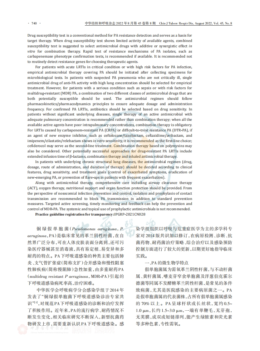 中华结核和呼吸杂志2022年8月第45卷第8期Chin J T山ere Respir Dis,August2022.Val.45.No.8·739··诊疗方案·中国铜绿假单胞菌下呼吸道感染诊治专家共识(2022年版)中华医学会呼吸病学分会感染学组通信作者:瞿介明,上海交通大学附属瑞金医院呼吸与危重症医学部,上海200025,Email:jmqu0906@163.com;施毅,解放军东部战区总医院呼吸与危重症医学科,南京210002,Email:shivi56@126.com【摘要】铜绿假单胞菌是难治性下呼吸道感染最常见致病菌之一,由于其耐药严重和易形成生物被膜,特别是近10多年来碳青霉烯类耐药株的出现,使其治疗更为困难:同时新的治疗药物和治疗策略不断问世,有必要加以评估以指导临床合理应用。中华医学会呼吸病学分会感染学组在《铜绿假单胞菌下呼吸道感染诊治专家共识(2014年版)》的基础上进行更新,并以临床诊治和预防的思路和技术为重点,以期为临床医生规范化诊治铜绿假单胞菌下呼吸道感染提供切实可行的参考。国际实践指南注册号:PGRP-2021CN028Chinese expert consensus on the management of lower respiratory tract infections ofPseudomonas aeruginosa in adults(2022)Pulmonary Infection Assembly of Chinese Thoracic SocietyCorresponding author:Qu Jieming,Department of Pulmonary and Critical Care Medicine,RuijinHospital,Institute of Respiratory Diseases,Shanghai Jiaotong University School of Medicine,Shanghai200025,China,Email:jmqu0906@163.com;Shi Yi,Department of Respiratory and Critical CareMedicine Jinling Hospital,Medical School of Nanjing University,Nanjing 210002,China,Email-shiyi56@126.c0mAbstract Pseudomonas aeruginosa(PA)is the second common Gram-negative bacteriumfor hospital acquired pneumonia(HAP)in China(16.9%-220%).The proportion of PA in communityacquired pneumonia (CAP)was about 1.0%,while increased to 18%-8.3%in severe CAP.PAaccounted for 67.0%of CAP in patients with a history of PA infection,bronchiectasis,very severechronic obstructive pulmonary disease (COPD)or tracheotomy.Considering the high disease burdenof lower respiratory tract infections (LRTIs)caused by PA,together with the progress in this field inrecent years,the Pulmonary Infection Assembly of Chinese Thoracic Society updated the "Chineseexpert consensus on the management of lower respiratory tract infections of Pseudomonasaeruginosa in adults (2014 version)",focusing on pathogen detection,diagnosis,antimicrobialtherapy,comprehensive management,infection prevention and control.PA causes both acute and chronic LTRIs.Acute LRTIs mainly include pneumonia (CAP HAP andventilator-associated pneumonia),tracheobronchitis,lung abscess and empyema.The diagnosis ofchronic LTRIs should be based on a comprehensive assessment of (1)underlying chronic structurallung diseases,such as bronchiectasis,cystic fibrosis,COPD,or immunocompromised conditions;(2)the presence of clinical manifestations of LRTIs;and (3)two times (at least 3 months apart)ofPA detected from eligible lower respiratory tract specimens within 1 year.It is important todistinguish infection from colonization when PA is isolated from lower respiratory tract specimens.D0L:10.3760/cma.j.cm112147-20220407-00290收稿日期2022-04-07本文编辑吕小东引用本文:中华医学会呼吸病学分会感染学组.中国铜绿假单胞菌下呼吸道感染诊治专家共识(2022年版)[U1中华结核和呼吸杂志,2022.45(8)739-752.D0:10.3760/cma.j.cn112147-20220407-00290