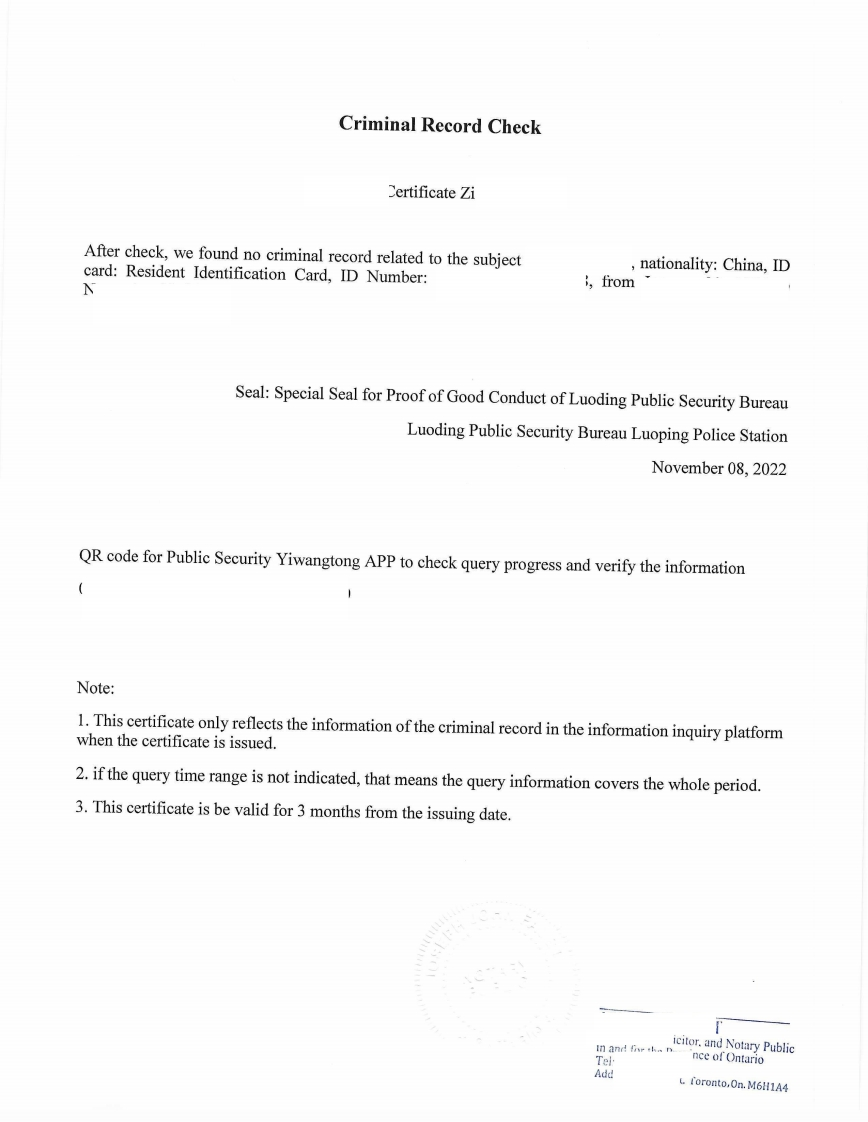 AFFIDAVITtranslator in the City of Toronto,Province of Ontario,make oathana say:1.I am fluent in both Chinese and English.2.I have translated the annexed document and carefully compared thetranslation from Chinese into English with regard to the followingdocument:Criminal Record Check3.The said translation is,to the best of my knowledge and ability,thecomplete and correct translation of said document.SWORN before me at the City of TorontoIn the Regional Municipality of Metropolitan)TorontoThisayo2022A Notary Public in and for theProvince of OntarioBarrister Solicitor,and Notary Publicin and for the Province of OntarioTel0AddToronto,On.M6H1A4