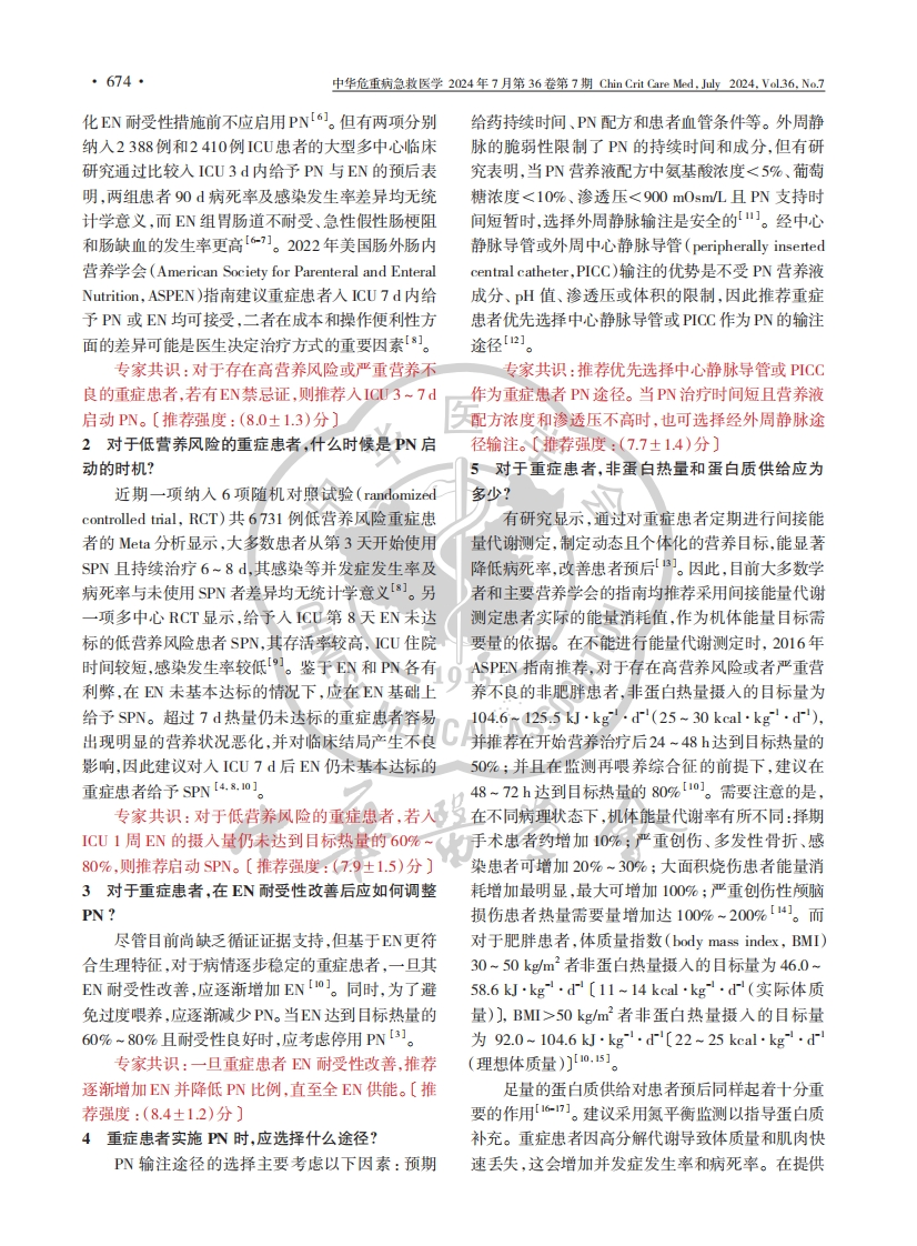 中华危重病急救医学2024年7月第36卷第7期Chin Crit Care Med,July2024,Vol.36,No.7673·专家共识·中国重症患者肠外营养治疗临床实践专家共识(2024)浙江省医学会重症医学分会通信作者:江荣林,Email:jiangronglin(@l26.com【摘要】重症患者营养不良发生率高,容易导致感染、CU获得性肌无力等不良预后,如何改善重症患者营养状况是目前一个重要难题。肠外营养(PN)是医学营养的重要组成部分,但目前如何针对重症患者实施合理规范的PN尚有较多争议。为进一步规范重症患者的P策略,浙江省医学会重症医学分会召集重症医学领域专家,制定了《中国重症患者肠外营养治疗临床实践专家共识(2024)》。该共识基于GRADE证据质量分级标准,以问题为导向,从PN时机、适宜人群、营养方案及成分比例等多方面总结循证医学证据,为临床营养实践中PN的规范化和标准化实施提供专业建议。【关键词】肠外营养;重症;专家共识义)实践指南注册:国际实践指南注册与透明化平台,PREPARE-2024CN753D0I:10.3760/cmaj.cn121430-20240123-00080Expert consensus on clinical practice of parenteral nutrition therapy for critically ill patients in China (2024)Zhejiang Medical Association Critical Care Medicine BranchCorresponding author:Jiang Ronglin,Email jiangronglin@126.com[Abstract)Critical patients have a high incidence of malnutrition.which can lead to adverse outcomes such asinfections and ICU-acquired weakness.Improving the nutritional status of critically ill patients is currently an importantchallenge.Parenteral nutrition(PN)is an important component of medical nutrition,but there is still much controversyover how to implement a reasonable and standardized PN for critically ill patients.To further standardize the PN strategyfor critically ill patients,the Critical Care Medicine Branch of the Zhejiang Medical Association convened experts inthe field of critical care medicine and formulated the Expert consensus on clinical practice of parenteral nutrition therapyfor critically ill patients in China (2024).This consensus is based on the GRADE evidence quality grading standard,problem oriented,and summarizes evidence-based medieine eyidence from multiple aspects such as PN timing.suitable population,nutritional plan,and ingredient ratio,providing professional suggestions for the standardization andaeciaeRenmiedhaglennSSimplementation of PN in clinical nutrition practice.Practice Guideline Registration:Practice Guideline Registration for Transparency.PREPA RE-2024CN753D0L:10.3760/cmaj.cm121430-20240123-00080重症患者营养不良发生率高达30%~50%,可号证据质量分级标准,以临床问题为导向,根据目前循导致总住院时间及重症监护病房(intensive care unit,证医学证据,制定了《中国重症患者肠外营养治疗ICU)住院时间明显延长,感染、ICU获得性肌无力?临床实践专家共识(2024)》,并请40位专家为每条等并发症显著增加【2]。医学营养治疗是重症患者推荐意见进行评分,以均数±标准差(x士s)列于推的重要治疗手段之一,在患者血流动力学及内环境荐意见之后作为推荐强度,为临床营养实践中PN的基本稳定的情况下,应实施积极的医学营养治疗,其规范化和标准化实施提供专业建议。本共识已通过中,肠外营养(parenteral nutrition,PN)是医学营养治国际实践指南注册与透明化平台(Practice Guideline疗的重要组成部分。国内外指南也推荐在肠内营养Registration for Transparency,PREPARE)进行了注册(enteral nutrition,EN)禁忌或不足时,可进行全胃肠(注册号:PREPARE-2024CN753)。外营养(total parenteral nutrition,TPN)或补充性肠外1对于有高营养风险或严重营养不良的重症患者,营养(supplementary parenteral nutrition,SPN)治疗。什么时候是PN启动的时机?目前认为,合理规范的PN可改善重症患者的临床既往研究表明,与PN相比,早期EN可降低重预后,但有关P的启动时机、方法、成分及剂量等症患者感染发生率,缩短ICU住院时间[s],因此建议问题仍然存在很多争议[。因此,浙江省医学会对于存在高营养风险或严重营养不良的重症患者,重症医学分会召集重症医学领域专家,基于GRADE应在不能耐受EN时才启动PN,且在未尝试所有优